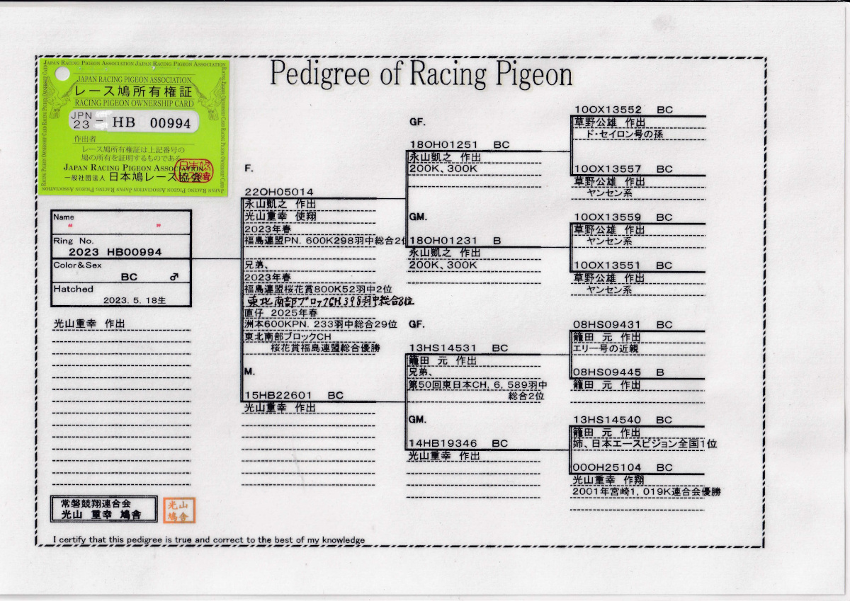 | 出品鳩♂22番「23HB00994 BC♂」光山重幸作半兄弟)25年桜花賞総合優勝 地区N600k298羽総合2位×籠田作エリー号系東日本CH総合2位兄弟の娘 | オークションNo: 1770280328 |