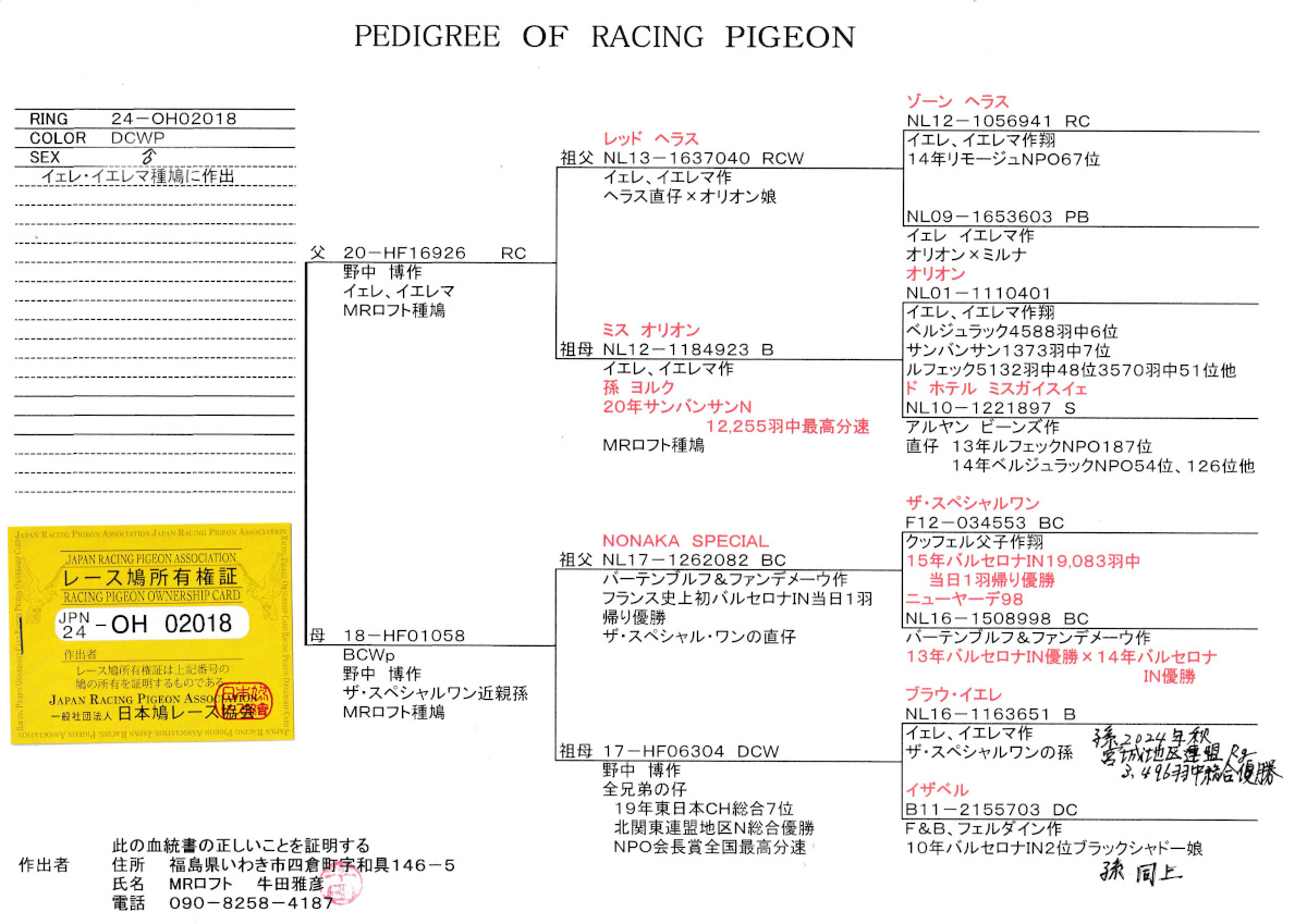 出品鳩♂26番「24OH02018 DCWP ♂」牛田雅彦鳩舎作両親野中作 両親イエレマ作(ヘッド・テラス号&オリオン号孫×ミスオリオン号&オリオン号娘)直仔×スペシャルワン号バルセロナIN総合優勝近親孫鳩 との直仔です。 父親 「20HF16926 RC」野中 博鳩舎作 両親イエレマ作 ヘッド・テラス号(ゾーンヘラス号×オリオン号娘)直仔×ミスオリオン号孫鳩サンバンサンN最高分速鳩(オリオン号×ドホテルミスガイスイェ号)娘鳩との直仔です。 母親 「18HF01058 BCWP」野中 博鳩舎作 バーテンブルグ作ノナカスペシャル号(スペシャルワン号バルセロナIN総合優勝×ニューヤーデ98号)直仔×(スペシャルワン号孫×ブラックシャトー号娘)娘鳩 との直仔です。 詳しくは、血統書を参照してください。 <備考> 現在管理人の鳩舎で元気に暮らしています。写真2/6日に撮影しました。 菅原明鳩舎の概要はこちらをご覧ください |