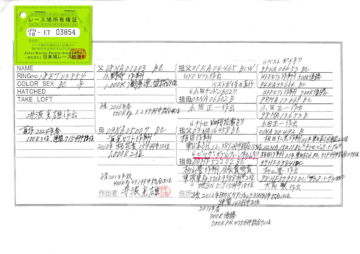 出品鳩♀12番「18ET03854 BC ♀」井波光雄鳩舎作小野寺信夫作翔09年800K3位連盟総合5位汐見1000K優勝連盟総合8位鳩×真光ロフト翔 桜花賞1000K2位159羽総合10位鳩 との直仔です。 父親 「08NA01003 BC」小野寺信夫鳩舎作翔 09年800K3位連盟総合5位 汐見1000K優勝連盟総合8位鳩で UFO作(500k優勝×700K優勝)直仔×小田チンドン602号 との直仔です。 母親 「09NA05007 BC」井波光雄鳩舎作真光ロフト翔 桜花賞1000K2位159羽総合10位鳩で チトセV桜花賞号相田作翔東日本CH12381羽総合53位×ビックダブルクィーン杉山号RG500K総合2位地区N700K総合18位連盟会長賞1位鳩 との直仔です。 詳しくは、血統書を参照してください。 <備考> 現在管理人の鳩舎で元気に暮らしています。写真2/6日に撮影しました。 菅原明鳩舎の概要はこちらをご覧ください |