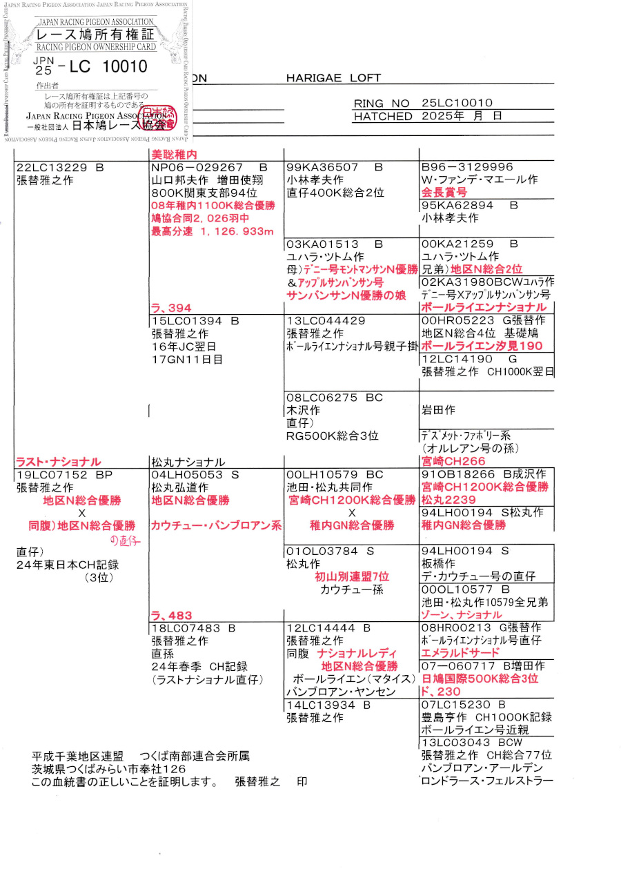 出品鳩若64番「25LC10010 B」張替雅之鳩舎作異父兄弟に24年東日本CH3位鳩がいる(美聡稚内号08年稚内GV総合優勝×ラ394号16年Jカップ翌日基礎鳩ボールライエンナショナル号の娘)直仔×ラスト・ナショナル号松丸ナショナル号地区N総合優勝の娘鳩 との直仔です。 父親 ♂27番 「22LC13229 B ♂」張替雅之鳩舎作 美聡稚内号08年稚内GV総合優勝・GN合同放鳩最高分速鳩 ×ラ394号16年Jカップ翌日 17年東日本GN11日目帰還鳩&基礎鳩ボールライエンナショナル号の娘鳩 との直仔です。 母親 ♀8番 “ラスト・ナショナル号”「19LC07152 B ♀」張替雅之鳩舎作直仔に24年東日本CH3位鳩がいる 松丸ナショナル号地区N総合優勝鳩×(地区N総合優勝の同腹&基礎鳩ボールライエンナショナル号孫鳩×東日本CH総合77位の娘)娘鳩 との直仔です。 詳しくは、添付の血統書の参照をお願いいたします。 <備考> 振込または、現金書留でお願いします。 菅原明鳩舎の概要はこちらをご覧ください |
