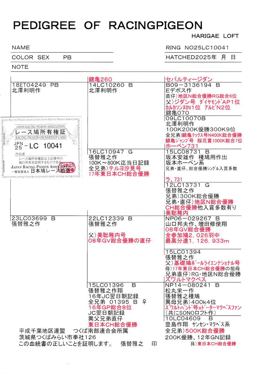出品鳩若84番「25LC10041 PB」張替雅之作北澤作(錦亀260号PN総合優勝半兄弟×GP800K鳩&テルヨ汐見号全兄弟)×美聡稚内号稚内GV総合優勝孫鳩 ![]() |