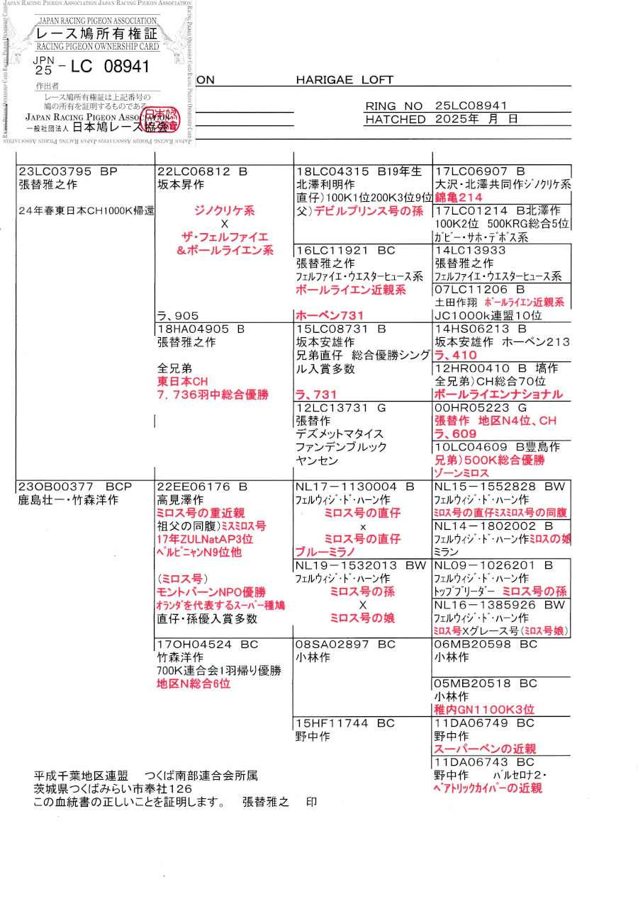 出品鳩若38番「25LC08941 BC」張替雅之作CH帰還鳩(坂本作錦亀214号孫×ラ905号&テルヨ汐見号全兄弟)×(両親ドハーン作銘鳩ミロス重近親XPN総合6位) ![]() |