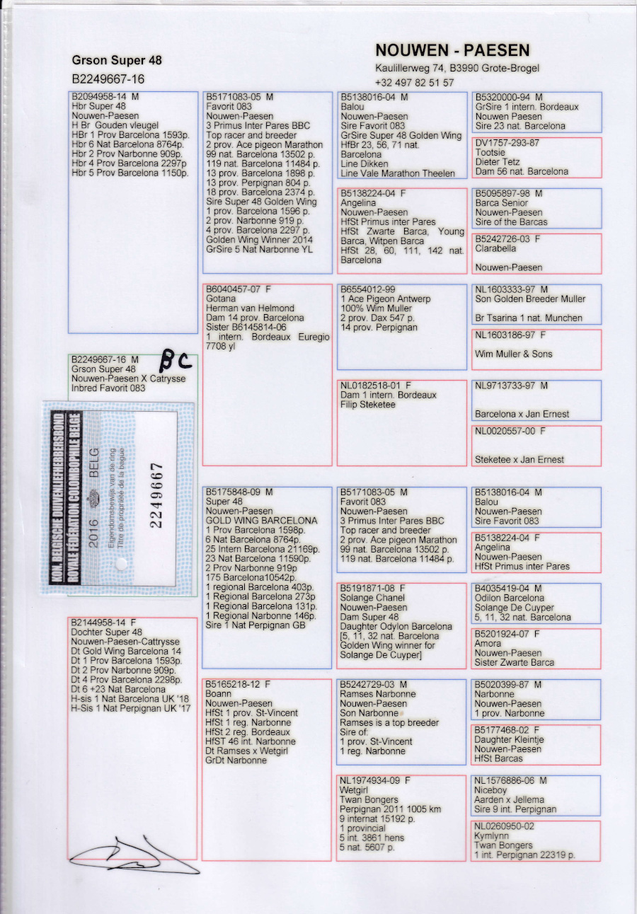 出品鳩「B16−22496677 BC♂」N・バーセン作スーパー48号バルセロナゴールデンウイング賞鳩バルセロナN6位23位異母兄弟×スーパー48号の娘 ![]() |