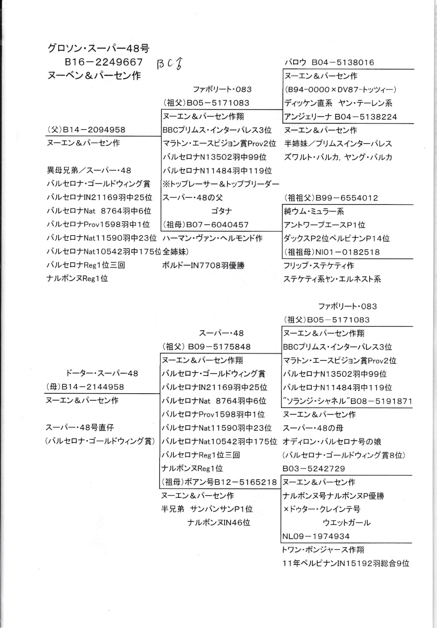 出品鳩"グロソン・スーパー48号"「B16−22496677 BC ♂」ヌーエン・パーセン作 スーパー48号バルセロナコールデンウイング賞鳩バルセロナN6位23位175位異母兄弟×スーパー48号バルセロナコールデンウイング賞鳩バルセロナN6位23位175位の娘鳩 との直仔です。 父親 「B14−2094958」ヌーエン・パーセン鳩舎作 異母兄弟に スーパー48号バルセロナコールデンウイング賞鳩バルセロナN6位23位175位鳩がいる ファボリット083号バルセロナプリズムインターパルス3位×ゴタナ号ハーマン・ヘルモンド作 ボルドーIN7708羽総合優勝鳩の全姉妹鳩 との直仔です。 母親 ”ドータースーパー48号”「B14−2144958」ヌーエン・バーセン鳩舎作 スーパー48号バルセロマナコールデンウイング賞鳩バルセロナN6位23位175位鳩 × ボアン号(ナルボンヌ号直仔×ペルピナンIN総合9位の娘)娘鳩 との直仔です。 詳しくは、血統書を参照してください。 <備考> 現在管理人の鳩舎で元気に暮らしています。写真2/9日に撮影しました。 菅原明鳩舎の概要はこちらをご覧ください |
