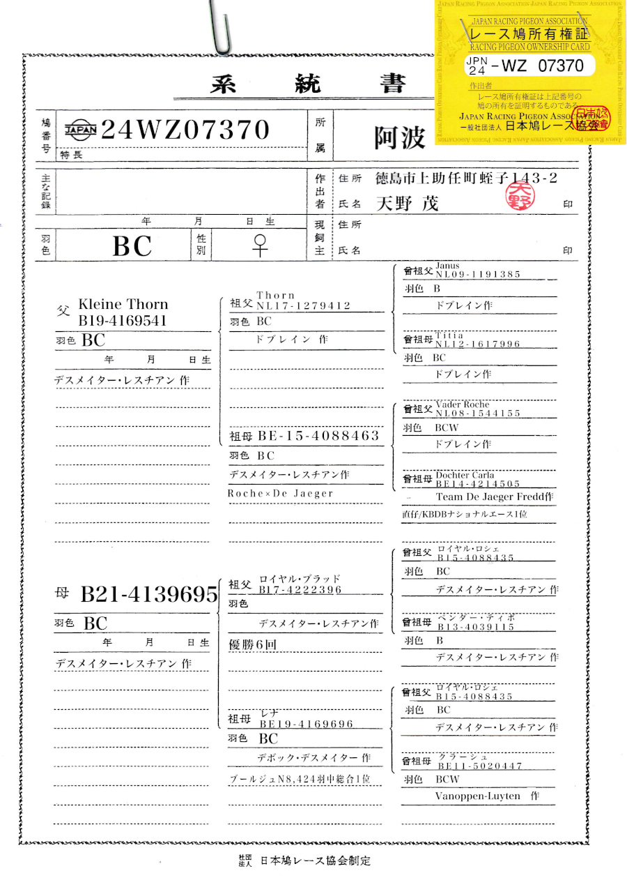 出品鳩「24WZ07370 BC♀」天野作両親デスメーター作ソラ号ブージュN8424羽66位ブロワP5208羽17位ヴィエルゾンP7838羽40位全兄弟×レナ号ブールジュN総合優勝娘 ![]() |
