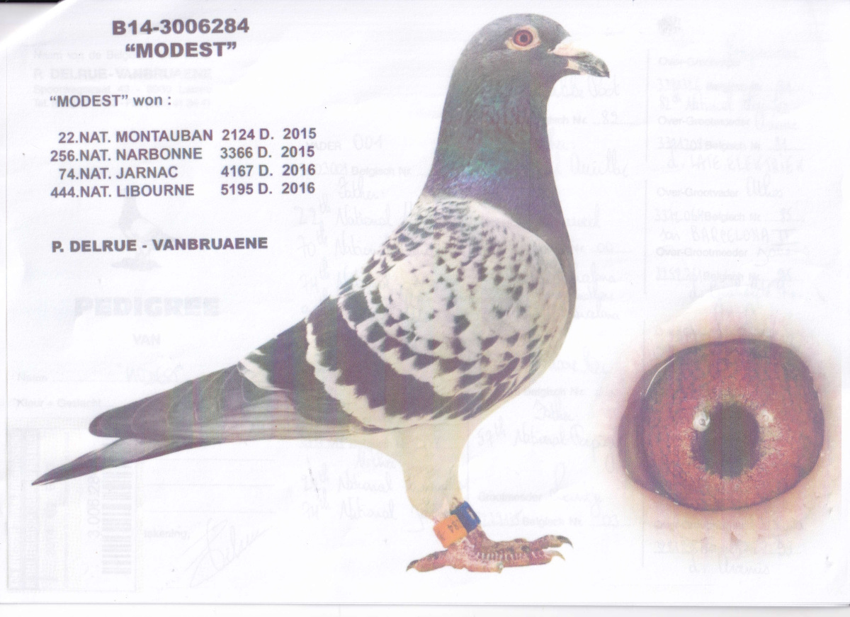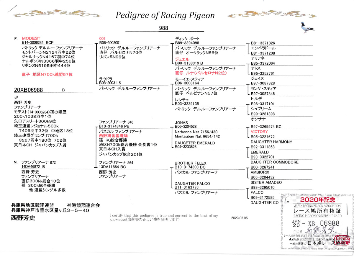 出品鳩「20XB06988 B ♂」西野芳史鳩舎作半兄弟に地区N総合57位鳩300K総合10位鳩がいる デルルファンブリアーナ作翔モデスト号モントバーンN2124羽22位ジャルナックN4167羽74位×西野ファンブリアーナ872号 との直仔です。 父親 ”モデスト号”「B14−3006284 BCP」パトリック・デルルファンブリアーナ鳩舎作翔モントバーンN2124羽22位ジャルナックN4167羽74位鳩 直仔に地区N総合57位鳩 異母兄弟にバルセロナN70位リボンヌN96位鳩がいる ルナ号バルセロナn2位イスフ兄弟×ラウドラ号(ペルピナンN57位異母兄弟)との直仔です。 母親 “ファンブリアーナ872号”「14DA46872 B」西野芳史鳩舎作 直仔に300K総合10位鳩がいる ファンブリアーナ346号西野ファンフヘリアーナ系基礎鳩(孫にRG総合優勝・地区N総合優勝会長賞1位)×ファンブリアーナ864号(両親パスカル作)との直仔です。 詳しくは、血統書を参照してください。 <備考> 振込または、現金書留でお願いします。 菅原明鳩舎の概要はこちらをご覧ください |