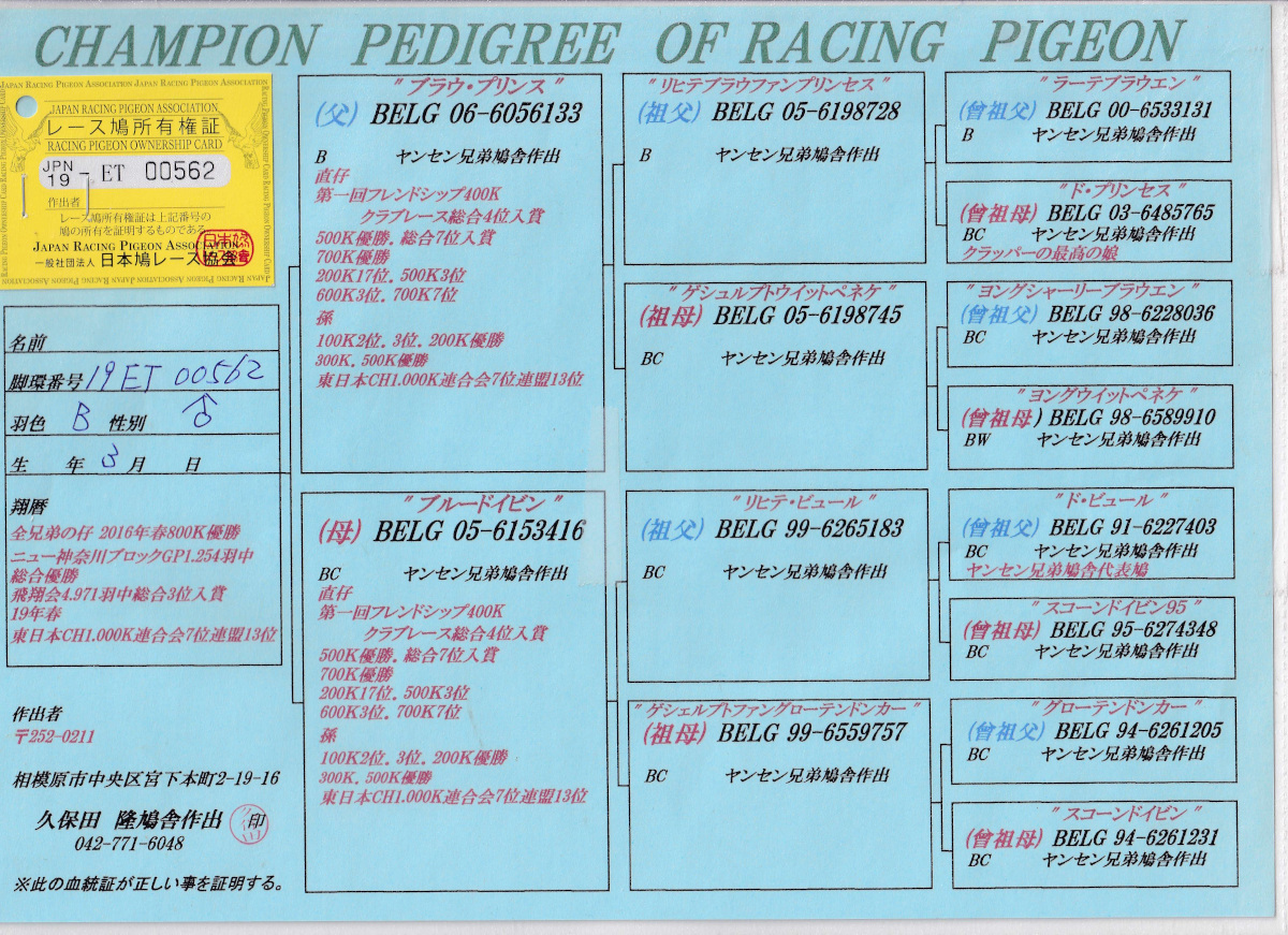 出品鳩「19ET00562 B♂」久保田 隆作全兄弟)400K総合4位500K総合7位600K3位700K優勝7位 両親ヤンセン兄弟作 ブラウ・プリンス号×ブルードン号 ![]() |