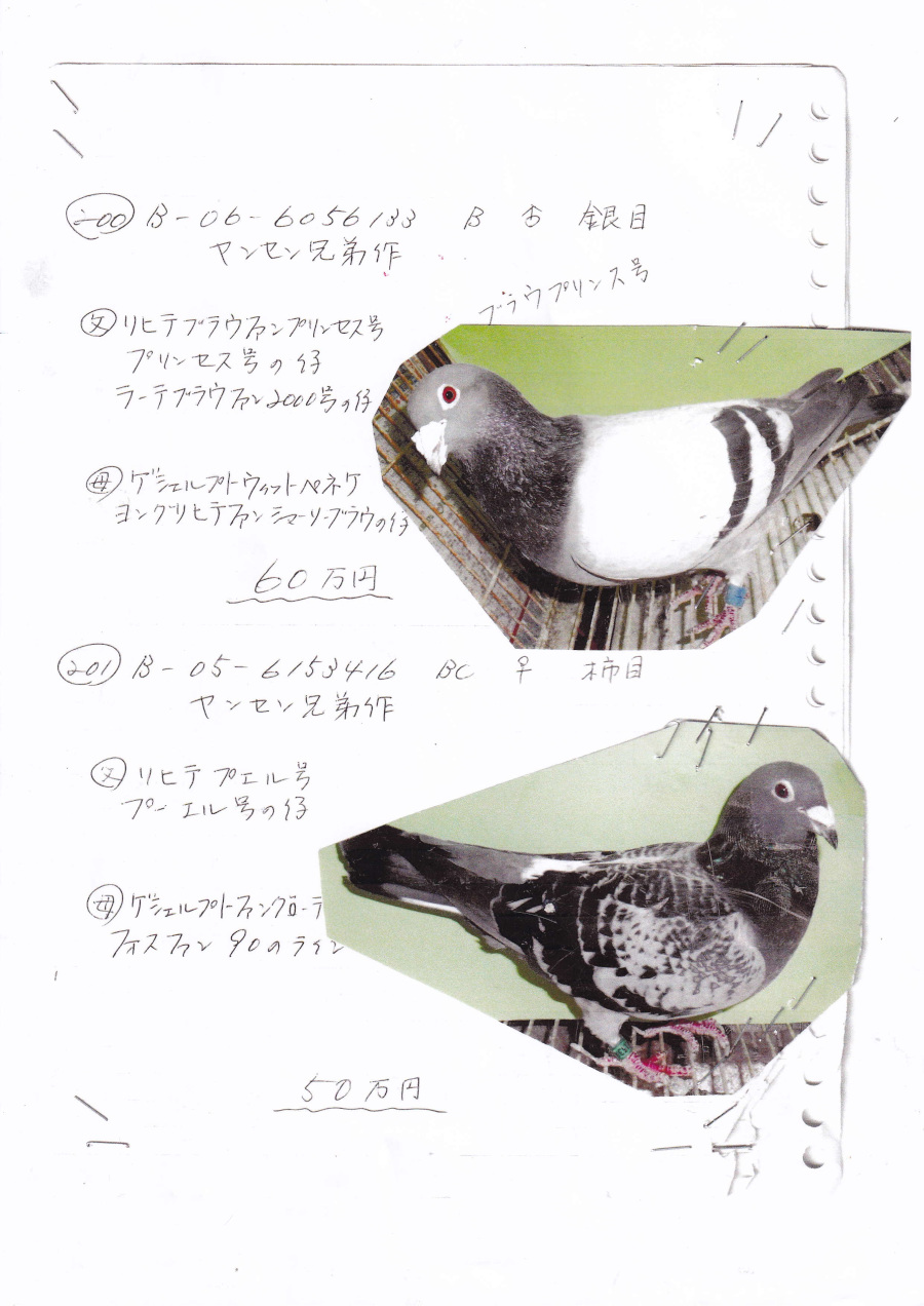 出品鳩「19ET00562 B♂」久保田 隆鳩舎作全兄弟に400k総合4位500k総合7位600K3位700K優勝7位鳩がいる 両親ヤンセン兄弟作 ブラウ・プリンス号×ブルードイビン号との直仔です。 父親 "ブラウ・プリンス号"「B06−6056133 B」ヤンセン兄弟鳩舎作 直仔に 400k総合4位500k総合7位600K3位700K優勝7位鳩がいる リヒテブラウファンプリンセス号×ゲシュルプトウイットペネケ号 との直仔です。 母親 "ブルードイビン号"「B05−6153416 BC」ヤンセン兄弟鳩舎作 直仔に 400k総合4位500k総合7位600K3位700K優勝7位鳩がいる リヒテ・ビュール号 ×ゲシェルプトファングローテンドンカー号 との直仔です。 詳しくは、血統書を参照してください。 <備考> 現在管理人の鳩舎で元気に暮らしています。写真2/9日に撮影しました。 菅原明鳩舎の概要はこちらをご覧ください |