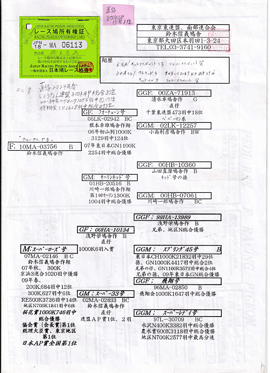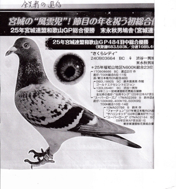 | 出品鳩「18MA06113 BC♂」鈴木作直仔)GP800K連盟3位全兄弟)キッドエクセレント1号(フォーチューン号×サハリンキッド号)×スーパーローズ号日本AP1位鳩 | オークションNo: 1770626308 |