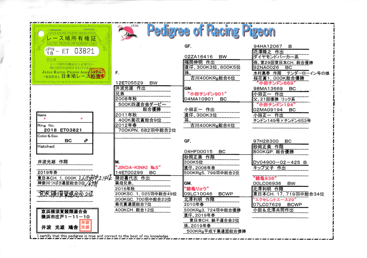 出品鳩♂8番「18ET03821 BC ♂」井波光雄鳩舎作翔19年東日本CH連盟総合3位3615羽総合214位鳩で 小田チンドン系500k4連合ダービー総合優勝 地区N700K682羽総合2位兄弟鳩×ジンダキンキNO5錦亀リョウ号RG500K3724羽総合優勝の娘鳩 との直仔です。 父親 「12ET05529 BW」井波光雄鳩舎作 直仔に 19年東日本CH連盟総合3位3位3615羽総合214位鳩 兄弟に 500k4連合ダービー総合優勝 地区N700K682羽総合2位鳩がいる 福岡作1000K総合優勝の直仔×小田チンドン901号 との直仔です 母親 ”ジンダキンキNO5”「14ET00299 BC」陣田喜代志鳩舎作 異母兄弟にRG500K5799羽総合2位鳩がいる 砂岡作300k5位(GP800K総合優勝×キップ父仔作)×錦亀リョウ号RG500K3724羽総合優勝鳩 との直仔です。 詳しくは、血統書を参照してください。 <備考> 現在管理人の鳩舎で元気に暮らしています。写真2/14日に撮影しました。 菅原明鳩舎の概要はこちらをご覧ください |