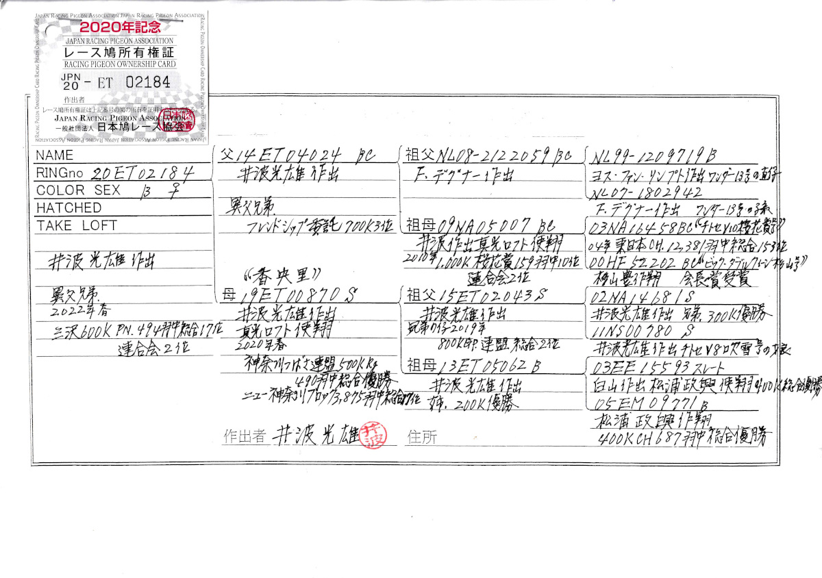 出品鳩♀26番「20ET02184 B♀」井波光雄作半兄弟)22年PN600K2位494羽総合17位 香央里号RG500Kつばさ連盟総合優勝の直仔 ![]() |