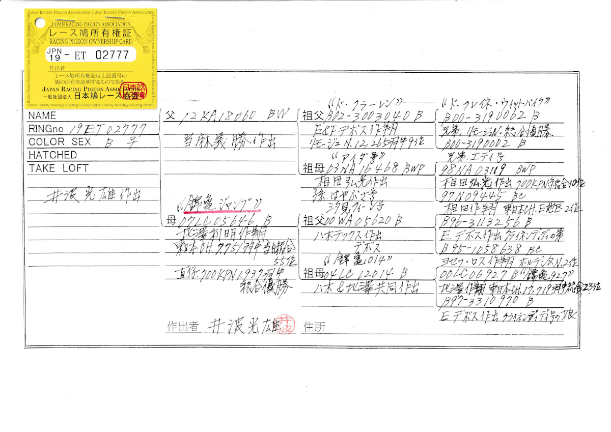 出品鳩♀23番「19ET02777 B♀」井波光雄作兄弟直仔)RG400K総合20位秋RG400K総合12位半兄弟)錦亀サポ号PN総合優勝 錦亀ジャンプ号CH総合55位直仔 ![]() |