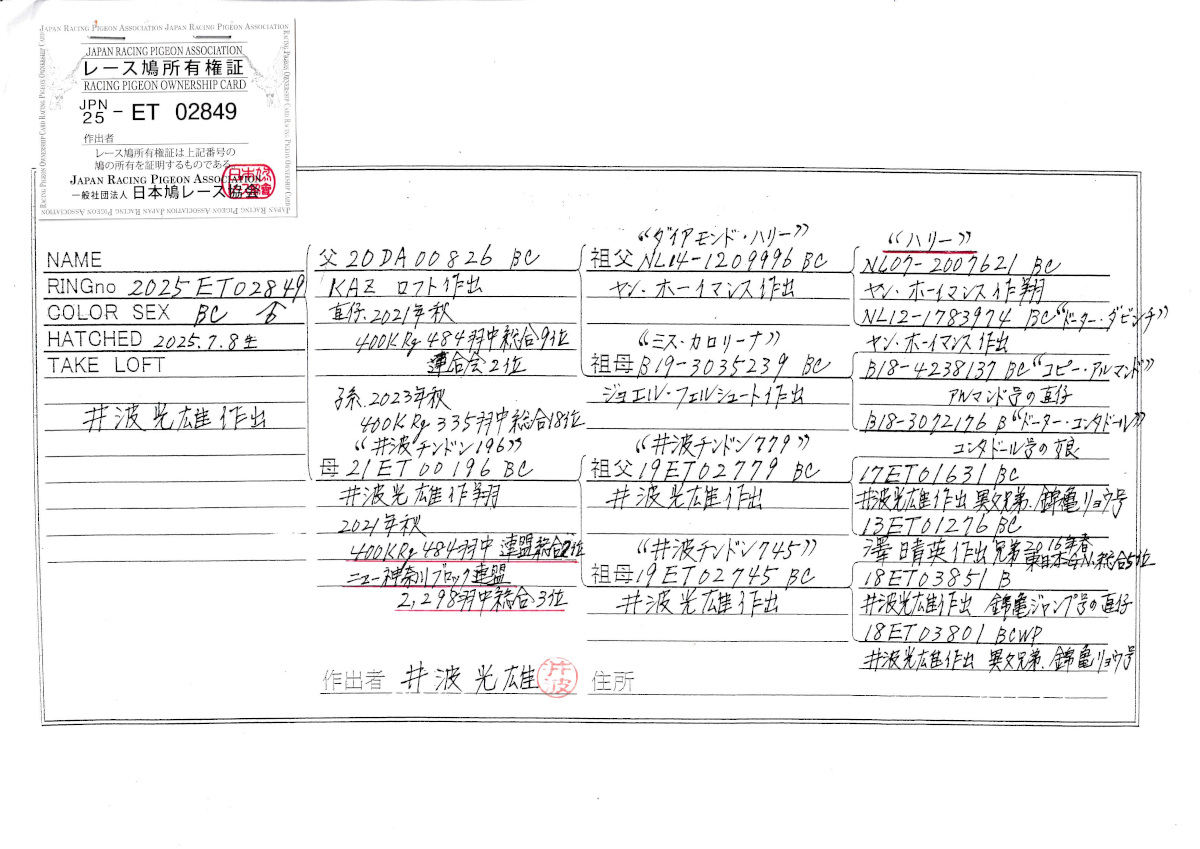 出品鳩♂28番「25ET02849 BC♂」井波光雄作半兄弟)RG400K総合9位 KAZ作ハリー号孫鳩 ×井波チンドン196号秋RG400K総合2位ブロック総合3位 ![]() |
