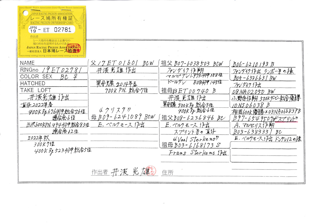 出品鳩♀24番「19ET02781 BC♀」井波光雄作直仔)春RG76位PN83位秋RG総合5位 PN総合7位半兄弟(ファンダイク作翔ペルピナン入賞直仔)×銘鳩スプリント号孫 ![]() |