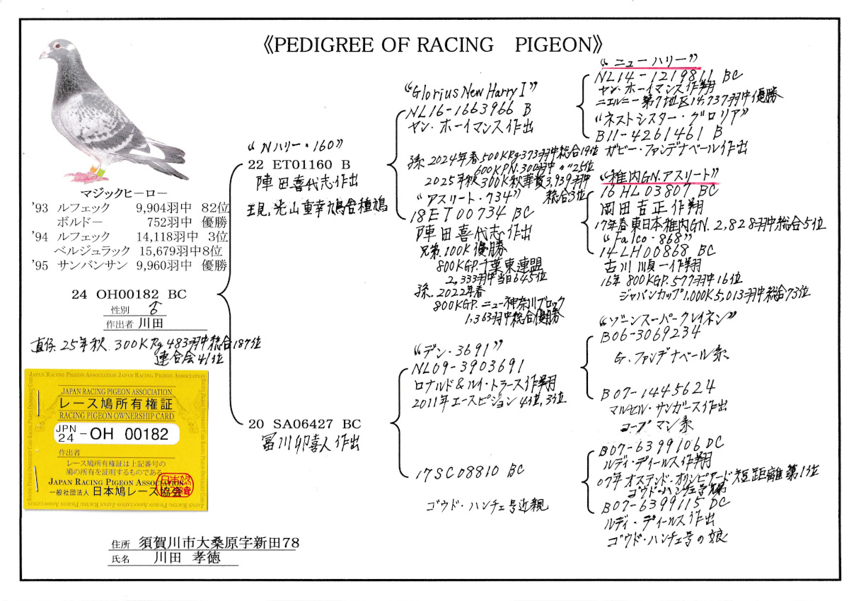 出品鳩♂25番「24OH00182 BC♂」川田孝徳作直仔)秋RG総合187位 陣田作ニューハリー号孫&GN総合5位孫×富川作トラース作翔11年AP4位3位の娘鳩 ![]() |