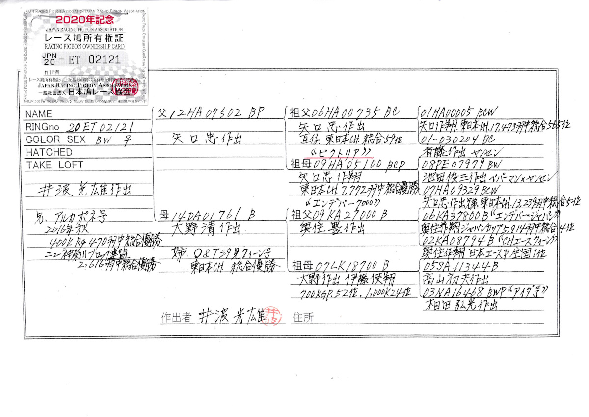 出品鳩♀25番「20ET02121 BW♀」井波光雄作 全兄弟)アルカポネ号ブロック400K総合優勝 矢口作東日本CH総合優勝直仔×大野作東日本CH総合優勝全姉妹 ![]() |