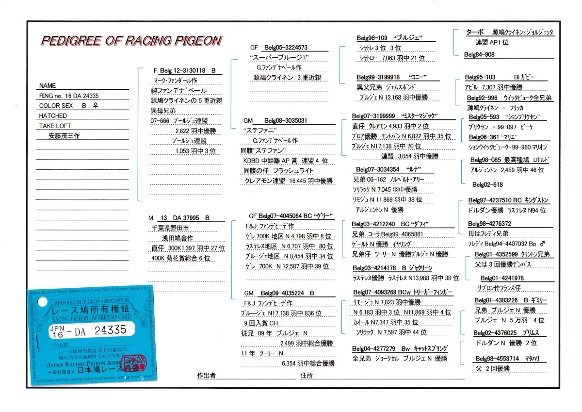 出品鳩♀1番「16DA24335 B ♀」安藤茂三鳩舎作異母兄弟に300K1397羽27位菊花賞400K総合6位鳩がいる M・ファンダール作(両親カビー作 源鳩クライネン5重近親)直仔×浅田作両親ファンデヒーデ作鳩ゲレNZ4798羽8位N39位の娘鳩 との直仔です。 父親 「B12−3130118B」マーク・ファンダール鳩舎作 両親カビーファンナベール作 源鳩クライネン5重近親鳩で 異母兄弟に ブールジュ連盟2622羽優勝1053羽3位鳩がいます。 母親 「13DA37995 B」浅田鳩舎作 直仔に300K1397羽27位菊花賞400K総合6位鳩がいる 両親ファンデヒーデ作ゲレNZ4798羽8位N39位×ブールジュN17138羽836位&リモージュN優勝3位4位の娘鳩 との直仔です。 詳しくは、血統書を参照してください。 <備考> 現在管理人の鳩舎で元気に暮らしています。写真2/6日に撮影しました。 菅原明鳩舎の概要はこちらをご覧ください |