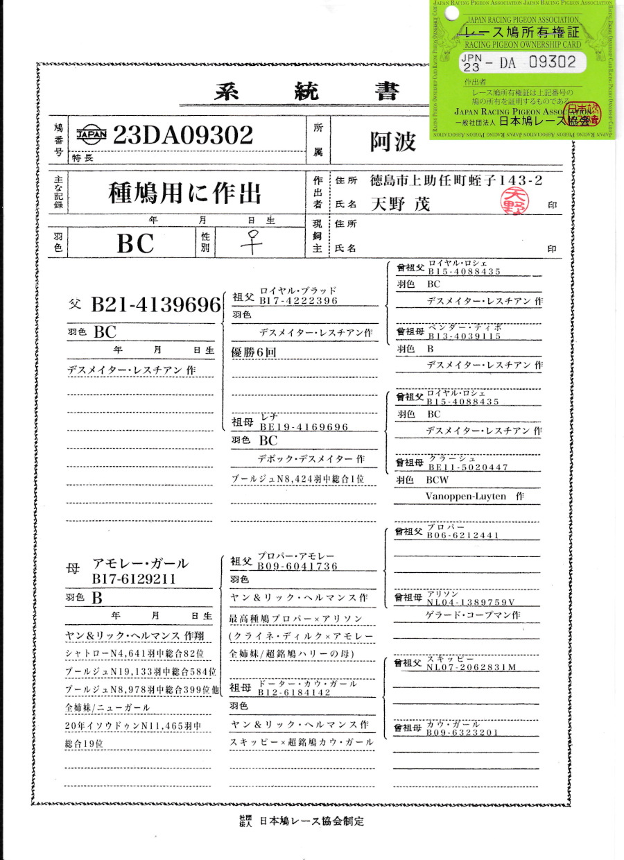 出品鳩「23DA09302 BC♀」天野作デスメーター作レナ号ブールジュN8424羽総合優勝直仔×ヘルマンス作翔シャトローN4641羽総合82位&銘鳩カウガール号孫鳩 ![]() |