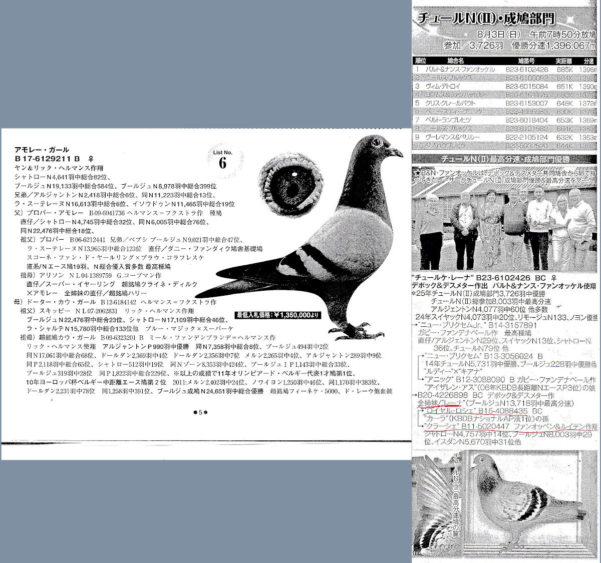 出品鳩「23DA09302 BC ♀」天野 茂鳩舎作デスメーター・レスチアン作レナ号ブールジュN8424羽総合優勝の直仔×ヤン&リック・ヘルマンス作翔 シャトローN4641羽総合82位&超銘鳩カウガール号孫鳩 との直仔です。 父親 「B21−4139696 BC」デスメーター・レスチアン鳩舎作 ロイヤル・ブラッド号優勝6回428羽98羽81羽80羽79羽54羽各優勝鳩×レナ号ブールジュN8424羽総合優勝鳩 との直仔です。 母親 "アモーレガール号"「B17−6129211 B」ヤン&リック・ヘルマンス鳩舎作翔 シャトローN4641羽総合82位ブールジュN138羽584位8978羽393位鳩で 最高種鳩プロパー号直仔×超銘鳩カウガール号娘鳩 との直仔です。 詳しくは、血統書を参照してください。 <備考> 現在管理人の鳩舎で元気に暮らしています。写真2/14日に撮影しました。 菅原明鳩舎の概要はこちらをご覧ください |