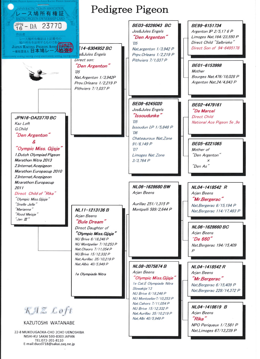 出品鳩「16DA23770 BC♂」KAZロフト作ド・アルジェントン号アルジェントンN3942総合優勝×銘鳩オリンビック・ミスハイシェ号の娘鳩 ![]() |