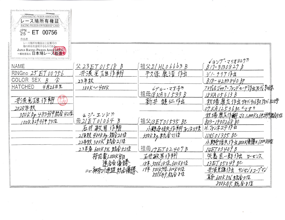 出品鳩若33番「25ET00756 B」井波光雄作翔秋RG300K486羽総合42位 ジエンド号地区N600K総合52位桜花賞1000K総合優勝鳩の直仔 ![]() |