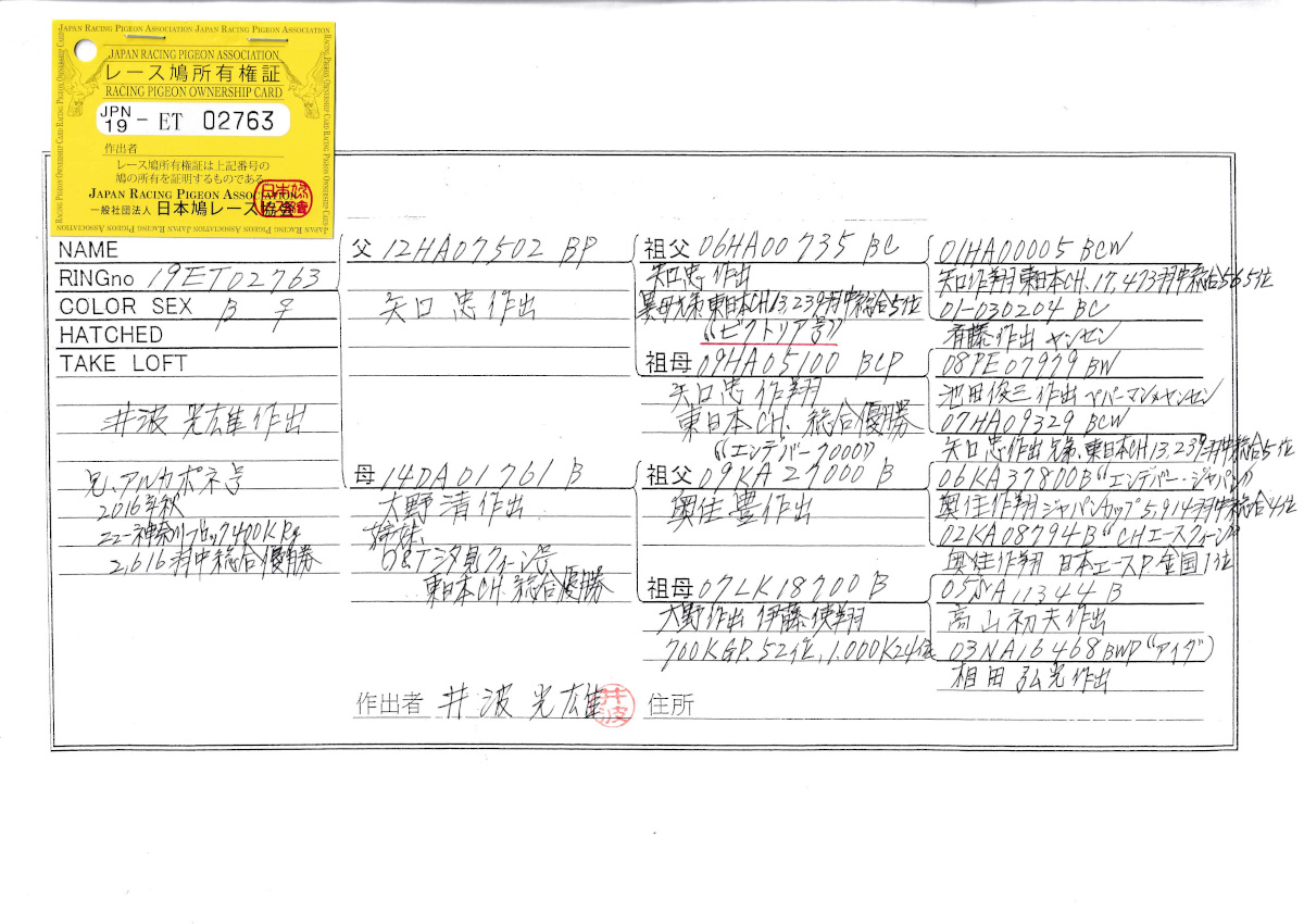 出品鳩♀21番「19ET02763 B♀」井波光雄作 全兄弟)アルカポネ号ブロック400K総合優勝 矢口作東日本CH総合優勝直仔×大野作東日本CH総合優勝全姉妹 ![]() |