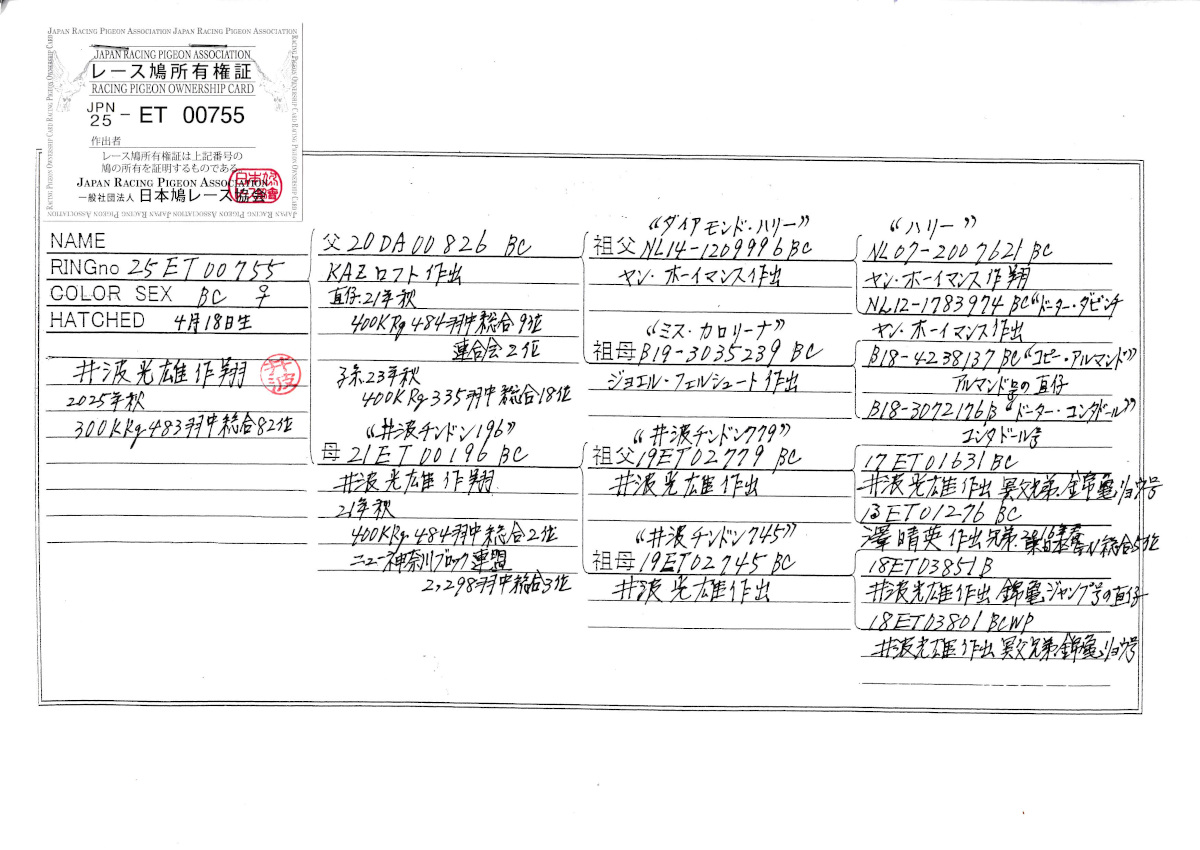 出品鳩若32番「25ET00755 BC」井波光雄作翔秋RG300K486羽総合82位半兄弟)RG総合9位 ハリー号孫鳩×井波チンドン196号秋RG400K総合2位ブロック総合3位 ![]() |