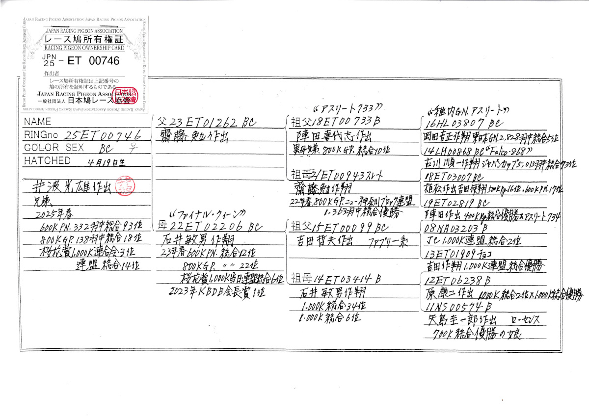 出品鳩若27番「25ET00746 BC」井波光雄作全兄弟)PN総合93位GP総合18位桜花賞総合14位 GP総合優勝直仔×桜花賞総合6位KBDB会長賞連盟1位 ![]() |