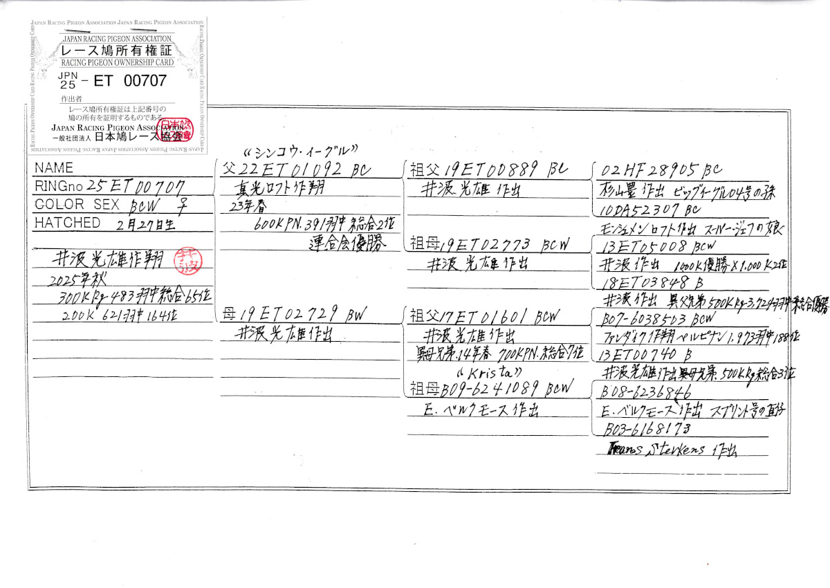 出品鳩若5番「25ET00707 B」井波作翔秋RG483羽総合65位シンコーイーグル号600K優勝総合2位×(ファンダイク作翔ペルピナン1973羽188位直仔×スプリント号孫) ![]() |