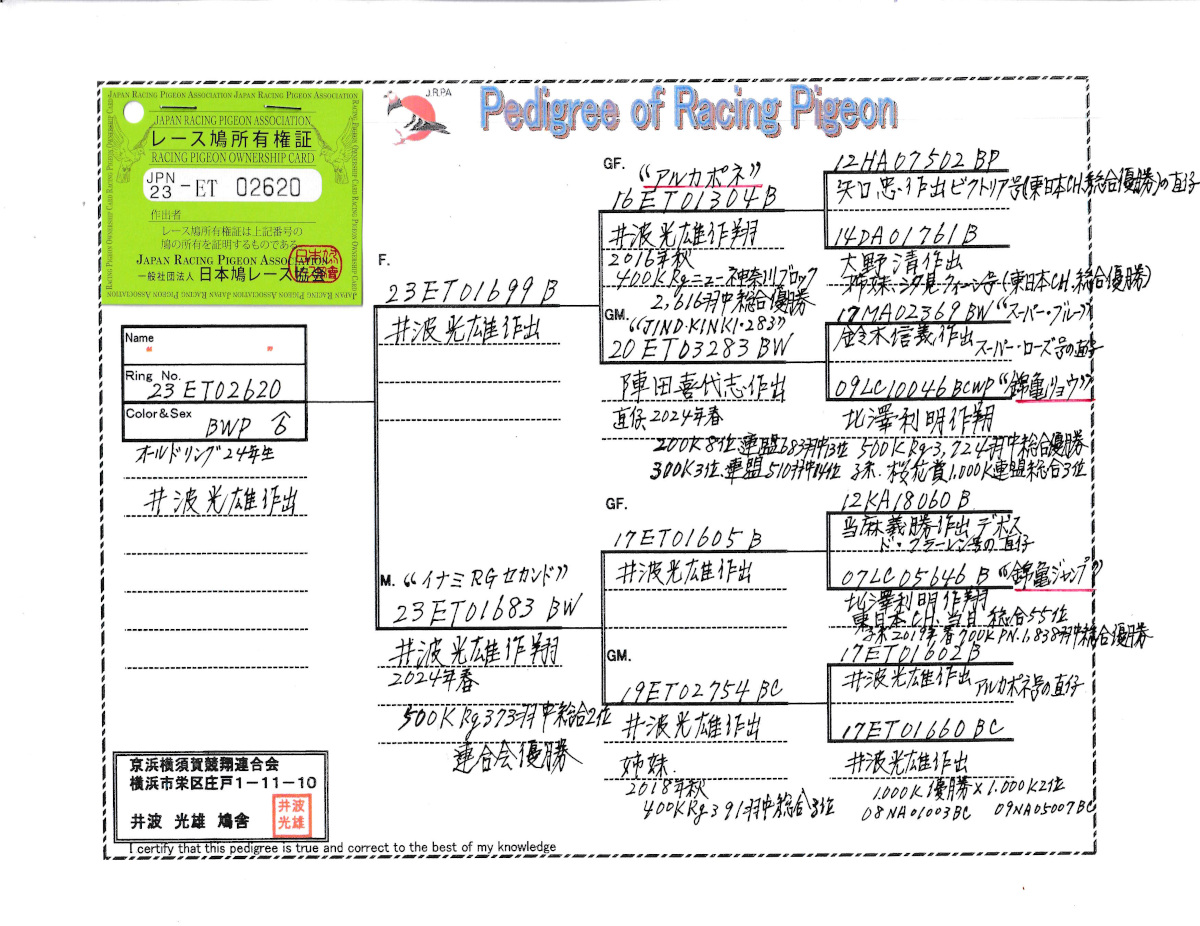 出品鳩♂20番24年生「23ET02620 BWP♂」井波光雄作アルカポネ号秋RG400K470羽総合優勝ブロック2616羽総合優勝直仔×イナミRGセカンド号RG500K373羽総合2位 ![]() |
