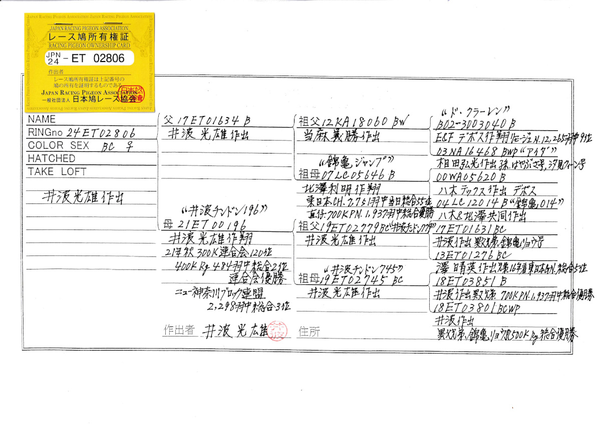 出品鳩♀38番「24ET02806 BC♀」井波光雄作錦亀サポ号PN総合優勝半兄弟&錦亀ジャンプ号東日本CH総合55位直仔×井波トンドン196号秋RG400K総合2位 ![]() |