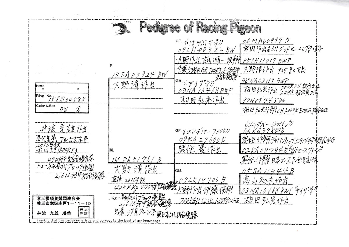 出品鳩♂1番「15ES04585 BW♂」井波光雄作半兄弟)アルカポネ号ブロック400K総合優勝両親大野作ハヤブサ号千葉5地区GP総合優勝直仔×東日本CH総合優勝全姉妹 ![]() |