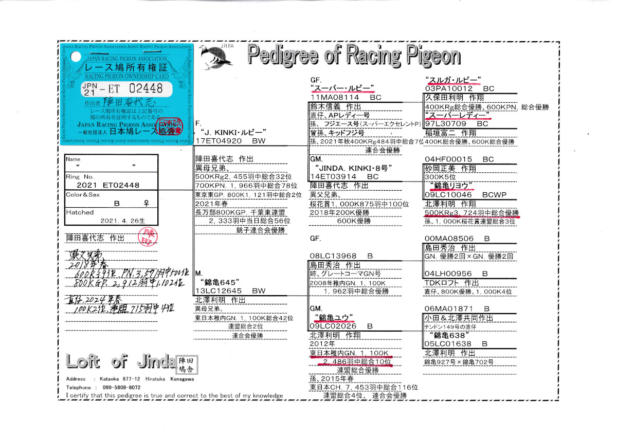 出品鳩♀29番「21ET02448 B ♀」陣田喜代志鳩舎作GP800K1121羽総合2位異母兄弟&スーハーレディ号錦亀リョウ号孫鳩×東日本GN1100k連盟2位総合42位異母兄弟&錦亀ユウ号東日本GN2486羽総合10位娘鳩 との直仔です。 父親 "J・キンキルビー号"「17ET04920 BW」陣田喜代志鳩舎作 異母兄弟にGP800K1121羽総合2位鳩がいる 鈴木作スーパールビー号(スルガルビー号×スーハーレディ号)×錦亀リョウ号RG500K3724羽総合優勝の娘鳩 との直仔です。 母親 "錦亀645号"{13LC12645 BW」北澤利明鳩舎作 直仔に GP800K2912羽1102位鳩 異母兄弟に 東日本GN1100k連盟2位総合42位鳩がいる 島田作グレートコマGN号GN総合優勝全兄弟×錦亀ユウ号東日本GN2486羽総合10位鳩 との直仔です。 詳しくは、血統書を参照してください。 <備考> 現在管理人の鳩舎で元気に暮らしています。写真2/20日に撮影しました。 菅原明鳩舎の概要はこちらをご覧ください |