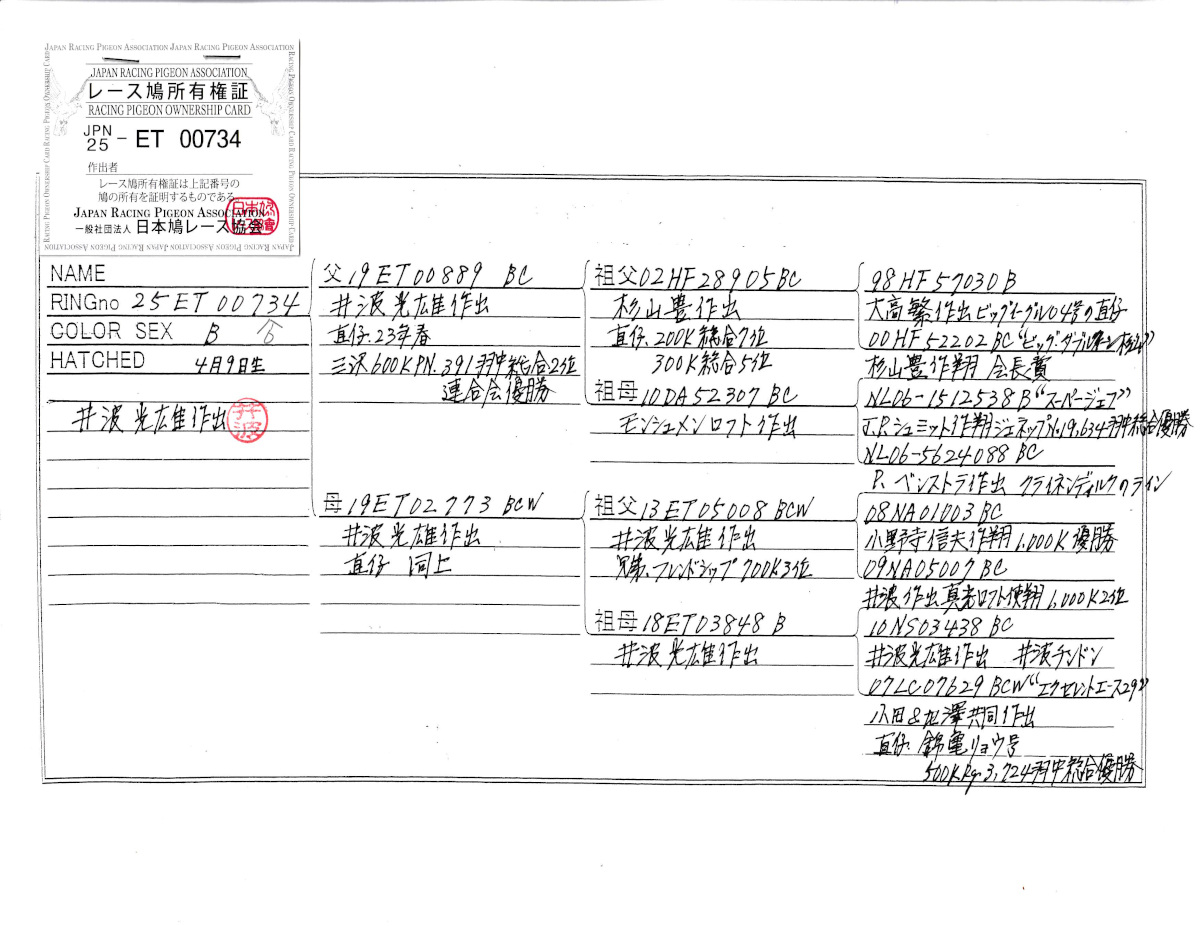 出品鳩若19番「25ET00734 B」井波光雄鳩舎作 23年春 三沢地区N600K優勝391羽総合2位鳩の全兄弟 ![]() |
