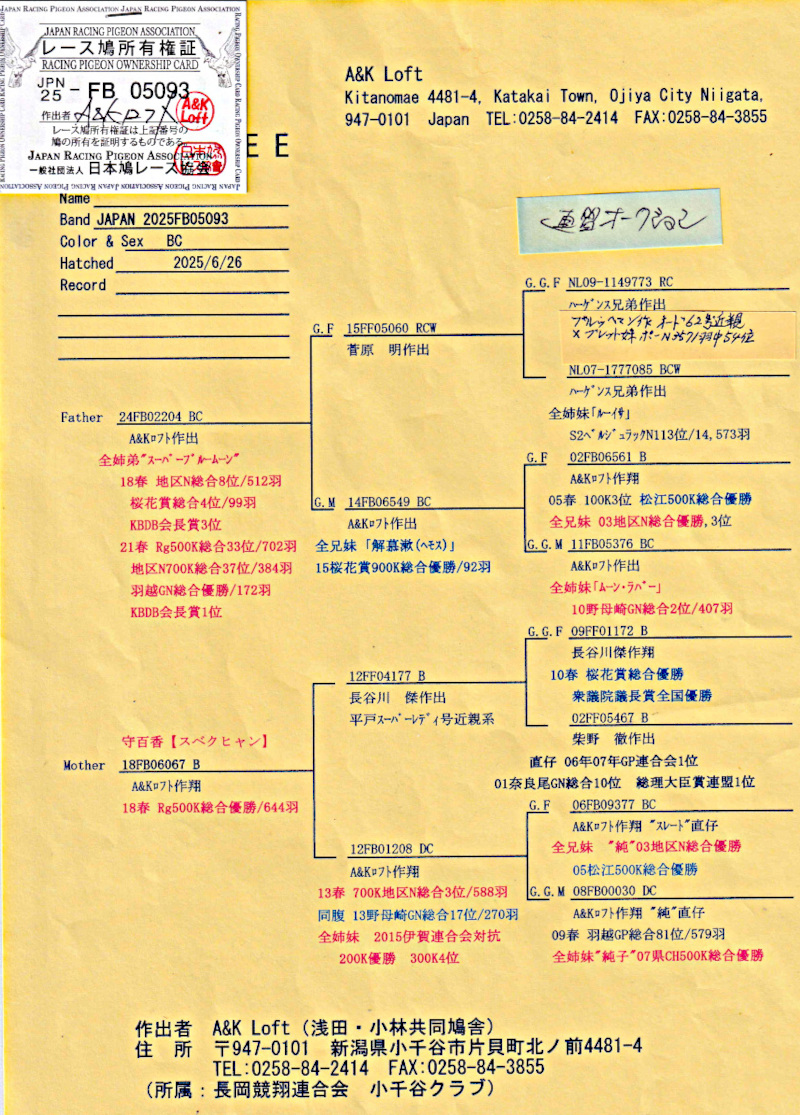 新潟連盟運営資金調達出品鳩「25FB05093 BC」A&Kロフト作スーパーブルームーン号21年羽越GN総合優勝の全兄弟×守百香号RG500K総合優勝鳩 ![]() |