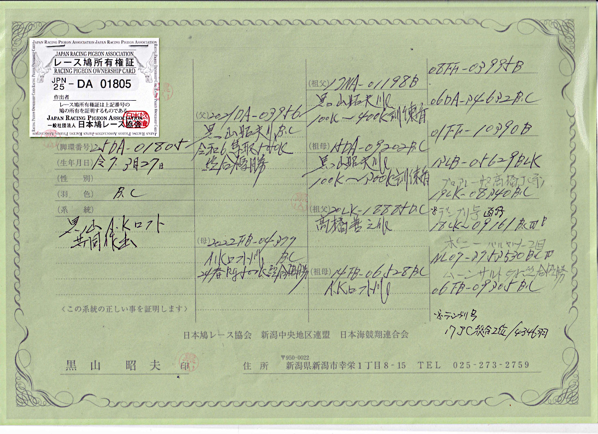 新潟連盟運営資金調達出品鳩「25DA01805 BC」黒山昭夫鳩舎・A&Kロフト共同作 黒山作R6年鳥取500K総合優勝 ×A&K作翔 24年春RG500K総合優勝鳩 同士の直仔です。 父親 「21DA03956 BC」黒山昭夫鳩舎作 R6年 鳥取500K総合優勝鳩で 両親はご自分で訓練した 400K訓練済×300K訓練済鳩 との直仔です。 母親 「22FB04377 BC」A&Kロフト作翔 24年春 RG500K総合優勝鳩で 高橋作デンブリ号JC総合2位孫 ×ムーンサルド号羽越GN総合優勝の娘鳩 との直仔です。 詳しくは、血統書を参照してください。 ※ 当該オークションの売り上げは「新潟連盟運営資金」として活用されますのでご理解ご協力をお願いします。 <備考> 現在管理人の鳩舎で元気に暮らしています。写真2/20日に撮影しました。 菅原明鳩舎の概要はこちらをご覧ください |