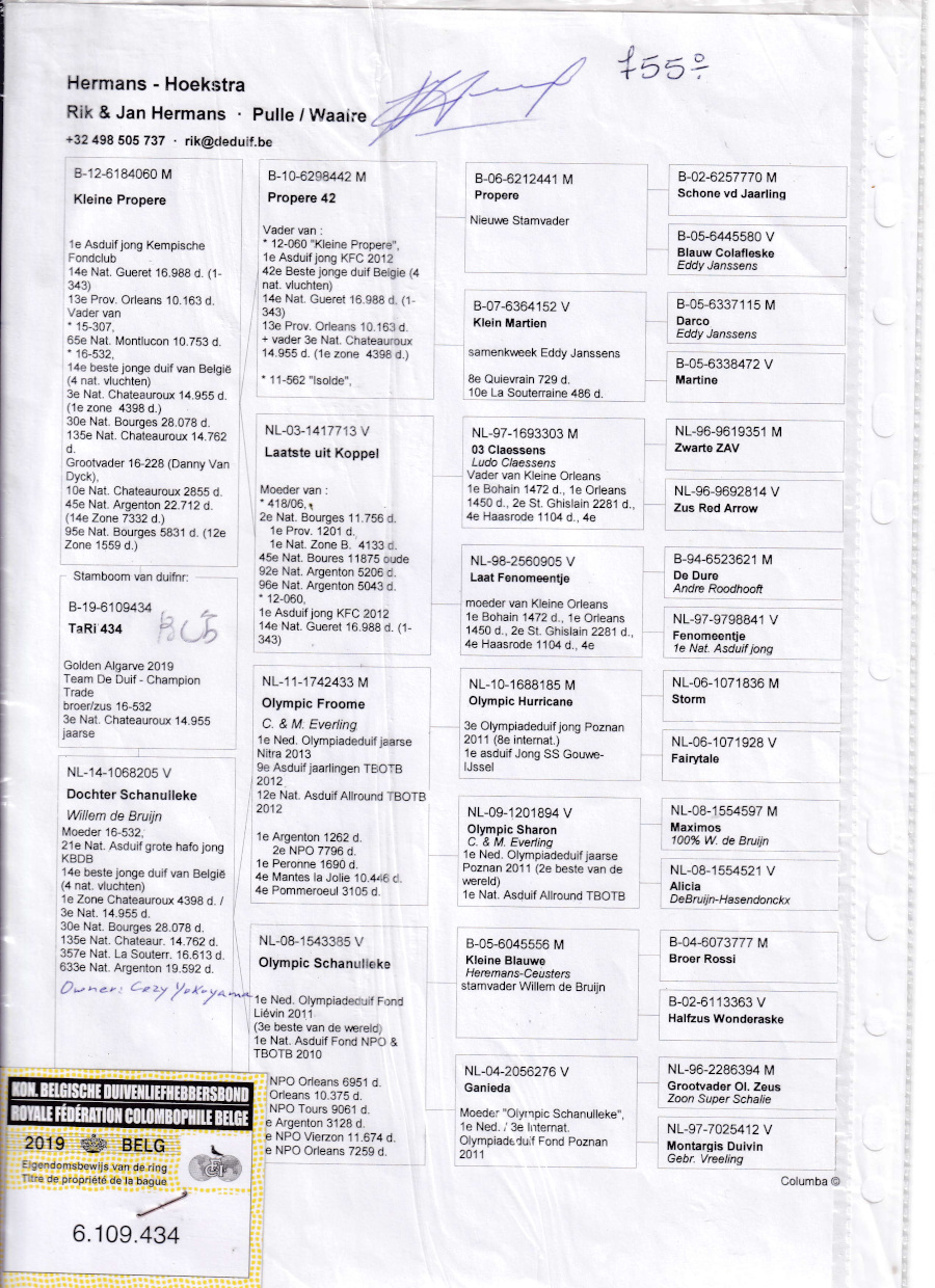 出品鳩"タリー434号"「B19−6106434 BC♂」ヤン&リック・ヘルマンス鳩舎作全兄弟にシャトローN14955羽3位ブールジュN28078羽30位鳩がいる クライネプロパー号12年エースP1位 ゲレN16988羽14位オルレアンP10163羽13位鳩×ドブレイン鳩舎作(オリンピクフローム号×オリンピック・シャネルケ号)娘鳩 との直仔です。 父親 "クライネプロパー号"「B12−6184060」ヤン&リック・ヘルマンス鳩舎作翔 12年エースP1位 ゲレN16988羽14位オルレアンP10163羽13位鳩で 直仔にもシャトローN14955羽3位ブールジュN28078羽30位鳩がいる プロパー42号(プロパー号直仔)×ラステ・ユニット・コッペル号(ブールジュN11756羽2位の母親) との直仔です。 母親 "ドゥター・シャネルケ号”「NL14−1068205」ドブレイン鳩舎作 直仔にシャトローN14955羽3位 ブールジュN28078羽30位鳩がいる オリンピクフローム号アルジェントンNPO7796羽2位マステス・ラ・ジョリー10446羽4位鳩×オリンピック・シャネルケ号オルレアンNPO6951羽3位10375羽8位ツールNPO9061羽8位鳩 との直仔です。 詳しくは、血統書を参照してください。 <備考> 現在管理人の鳩舎で元気に暮らしています。写真2/20日に撮影しました。 菅原明鳩舎の概要はこちらをご覧ください |