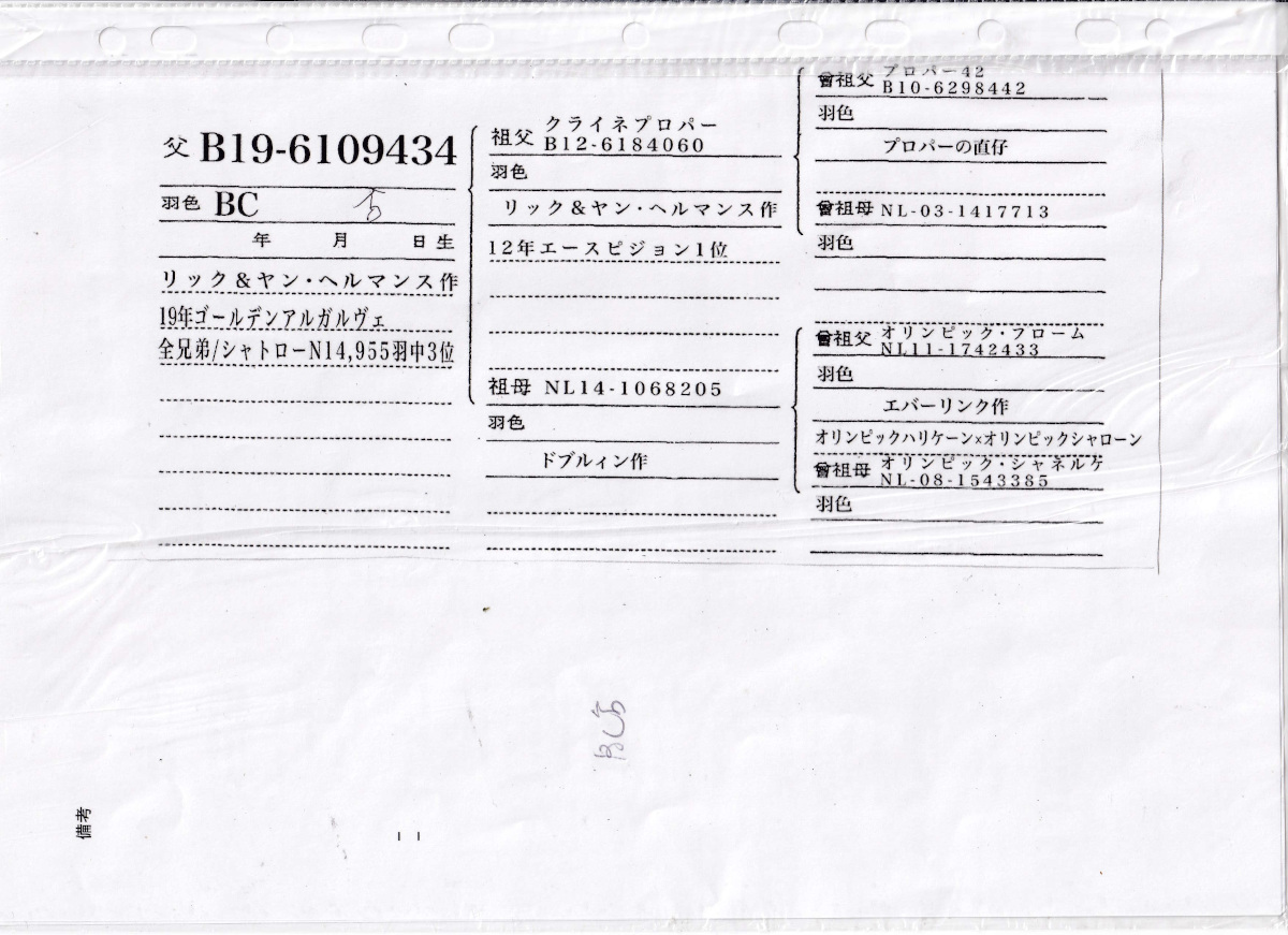 出品鳩「B19−6106434 BC♂」ヘルマンス作全兄弟)シャトローN3位他鳩クライネプロパー号12年AP1位×(オリンピックフローム×オリンピックシャネルケ) ![]() |