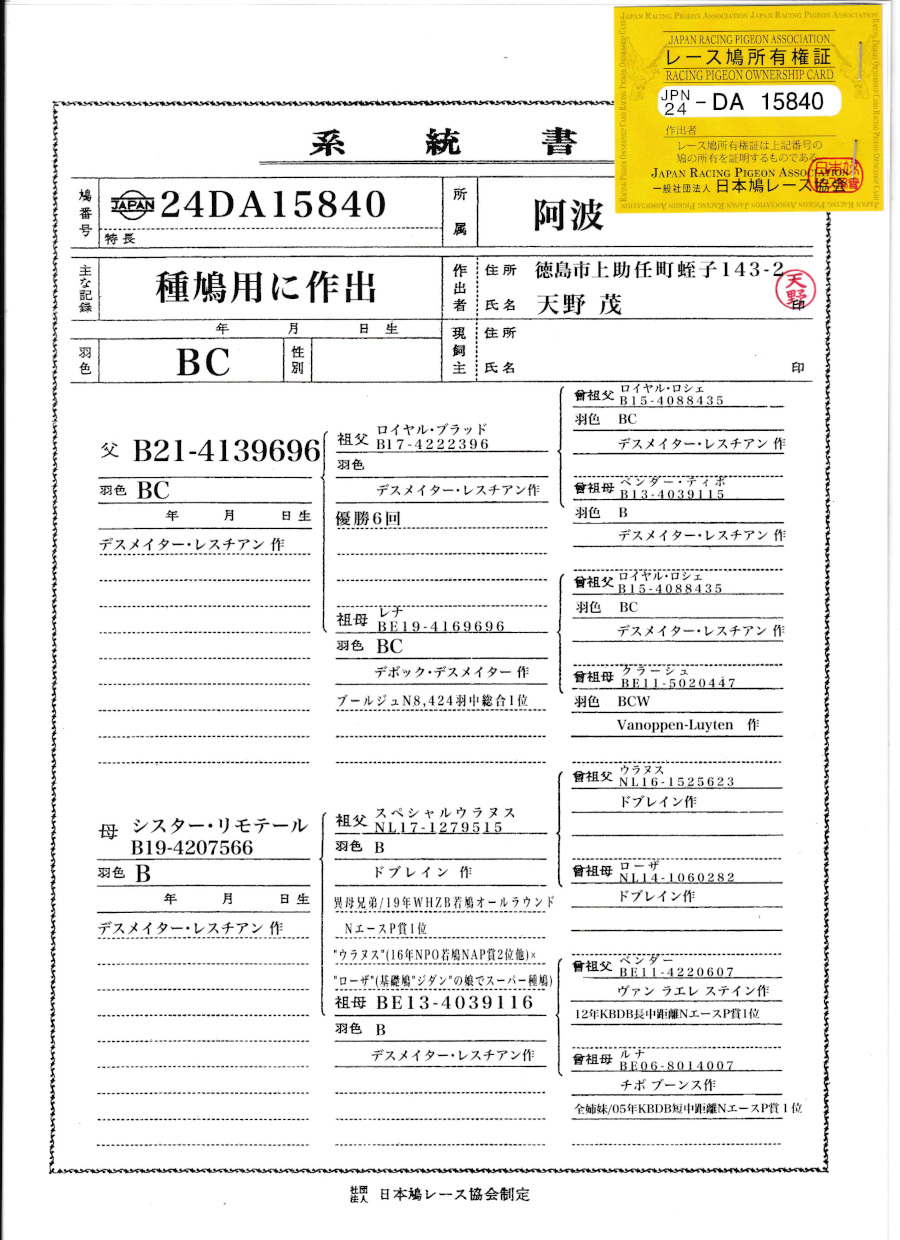 出品鳩「24DA15840 BC♂♀」天野 茂作両親デスメーター作レナ号ブールジュN8424羽総合優勝直仔×ベダー号KBDB中長距離NエースP1位の孫鳩 ![]() |