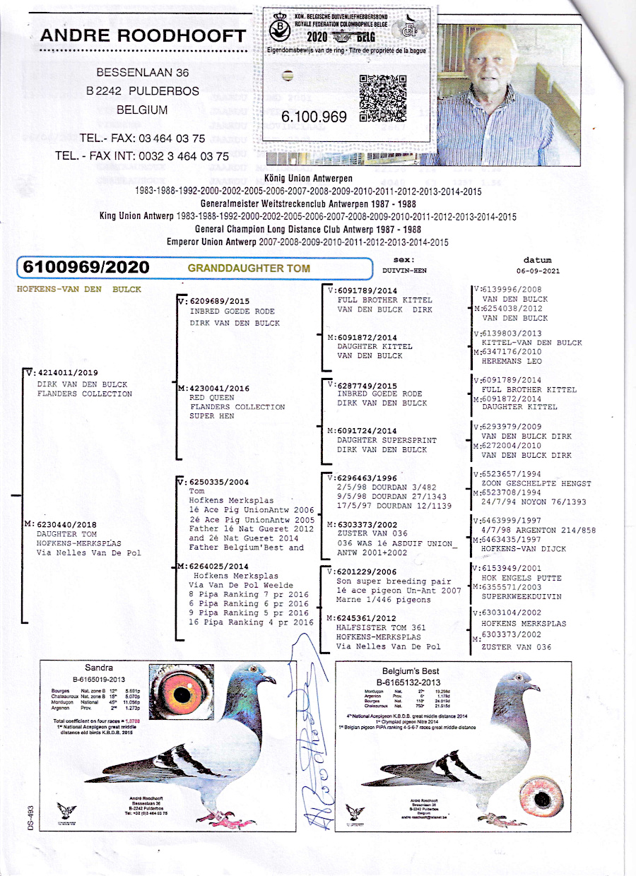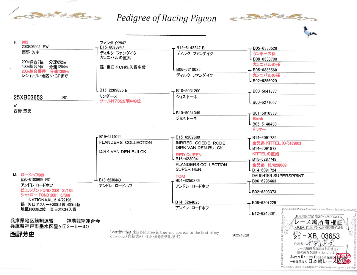 出品鳩「25XB03653 RC」西野芳史鳩舎作200K総合優勝総合7位 400K総合9位(D・ファンダイク作カンニバル号近親鳩 ×リンダース作翔ツールN7322羽8位)×ロードホフ作翔ビェルゾン185羽2位シャトロー506羽N22196羽214位鳩(キッテル号全兄弟の孫×代表鳩トム号の娘) との直仔です。 鳩 との直仔です。 父親 "902号"「20XB06902 BW」西野芳史鳩舎作委託 200K総合優勝総合7位 400K総合9位GP700K迄 D・ファンダイク作カンニバル号近親鳩 ×リンダース作翔両親ヨストーネ作ツールN7322羽8位鳩 との直仔です。 母親 ”ロードホフ969号”「B20−6100969 RC」A・ロードホフ鳩舎作翔ビェルゾン185羽2位シャトロー506羽6位N22196羽214位鳩で キッテル号全兄弟の孫 ×代表鳩トム号の娘鳩 との直仔です。 詳しくは、血統書を参照してください。 <備考> 現在管理人の鳩舎で元気に暮らしています。写真2/20日に撮影しました。 菅原明鳩舎の概要はこちらをご覧ください |