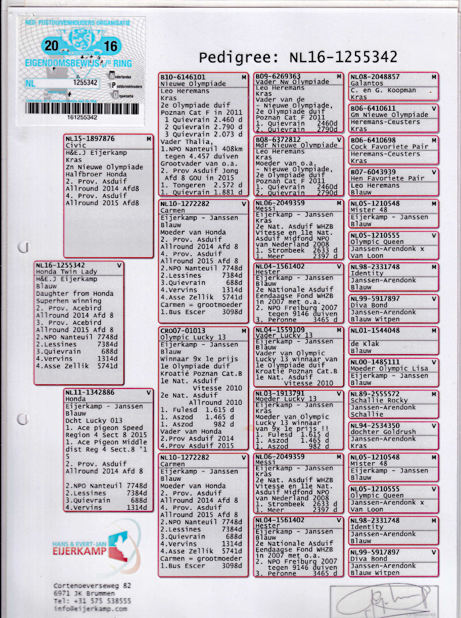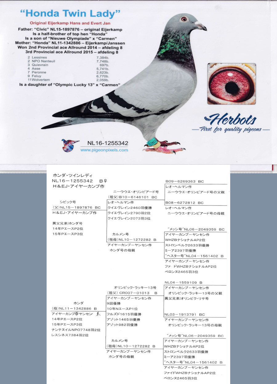 出品鳩 "ホンダ・ツインレディ号"「NL16−1255342 B♀」H&EJ・アイヤーカンプ鳩舎作 レオ・ヘルマン作翔ニーウウェ・オリンピアード号直仔×ホンダ号アイヤーカンプ−ヤンセン作14年15年PエースP2位3位ナンテヌイルNPO7748羽2位鳩 との直仔です。 父親 ”シビック号”「NL15−1897876 BC」H&EJ・アイヤーカンプ鳩舎作 異父兄弟にホンダ号PエースP2位3位鳩がいる レオ・ヘルマン作翔ニーウウェ・オリンピアード号 × カルメン号(NエースP2位×NエースP2位)との直仔です。 母親 ”ホンダ号”「NL11−1342886 B」アイヤーカンプ鳩舎作 ヤンセン系14年15年PエースP2位3位ナンテヌイルNPO7748羽2位 レスシネス7384羽2位鳩で オリンビック・ラッキー13号×カルメン号 との直仔です。 詳しくは、血統書を参照してください。 <備考> 現在管理人の鳩舎で元気に暮らしています。写真2/20日に撮影しました。 菅原明鳩舎の概要はこちらをご覧ください |