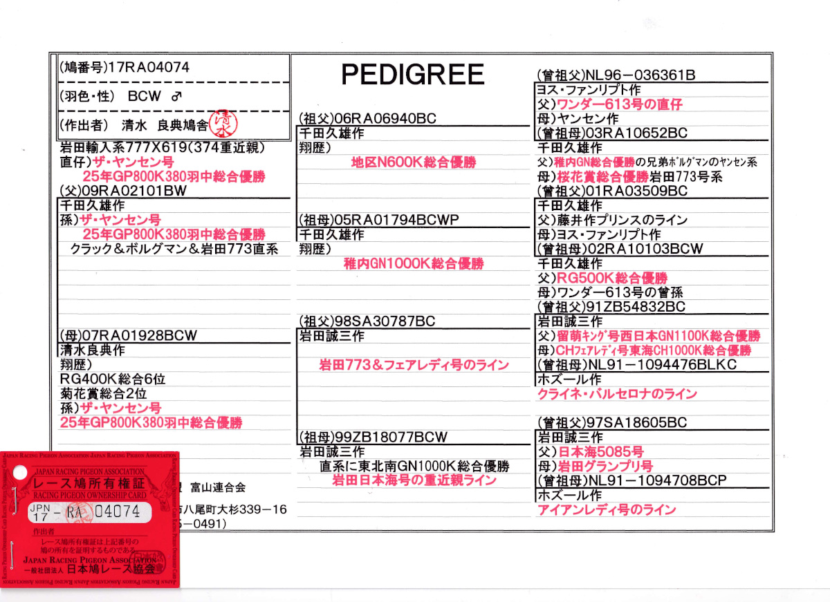 出品鳩♂15番「17RA04074 BCW♂」清水良典作直仔)ザ・ヤンセン号北陸GP800K380羽総合優勝 岩田輸入系(777X619)374重近親 ![]() |