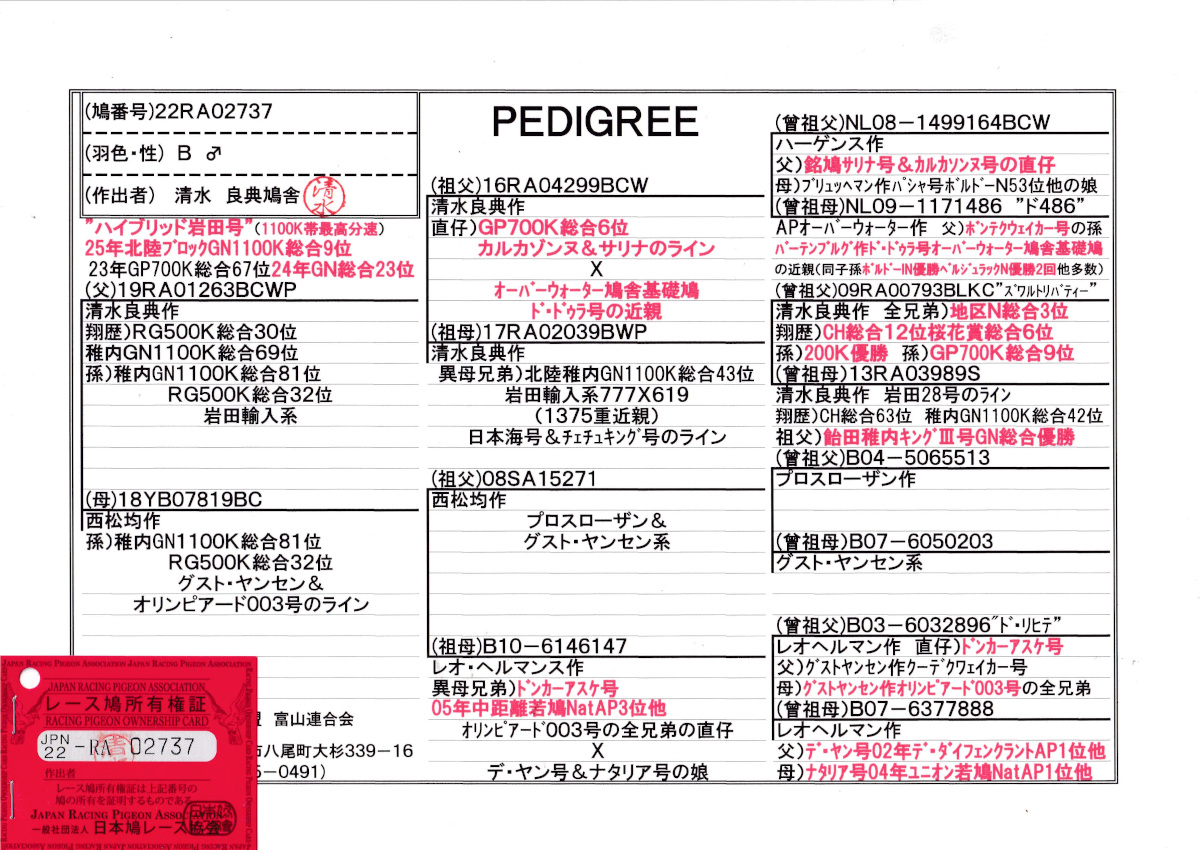 出品鳩♂39番「22RA02737 B♂」清水良典作翔25年北陸GN1100K総合9位24年総合23位鳩 直仔)GN総合81位 3代稚内GN入賞の二代目 ![]() |