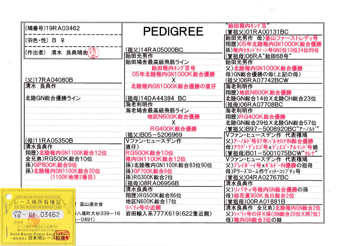 出品鳩♀28番「19RA03462 B♀」清水良典作北陸飛び筋(飴田稚内系×海老稚内系)×GN総合12位(アーノルド孫×PN総合17位&岩田系リバティ号GN総合優勝近親) ![]() |