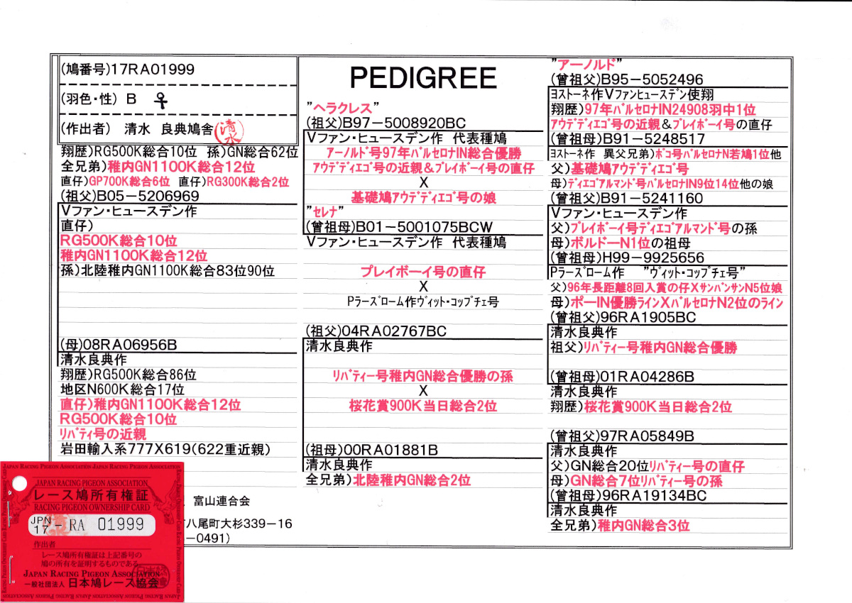 出品鳩♀14番「17RA01999 B♀」清水良典作翔RG500K総合10位直仔)RG総合2位GP700K総合6位全兄弟)GN総合12位アーノルド号孫×PN総合17位&シバティ号近親 ![]() |