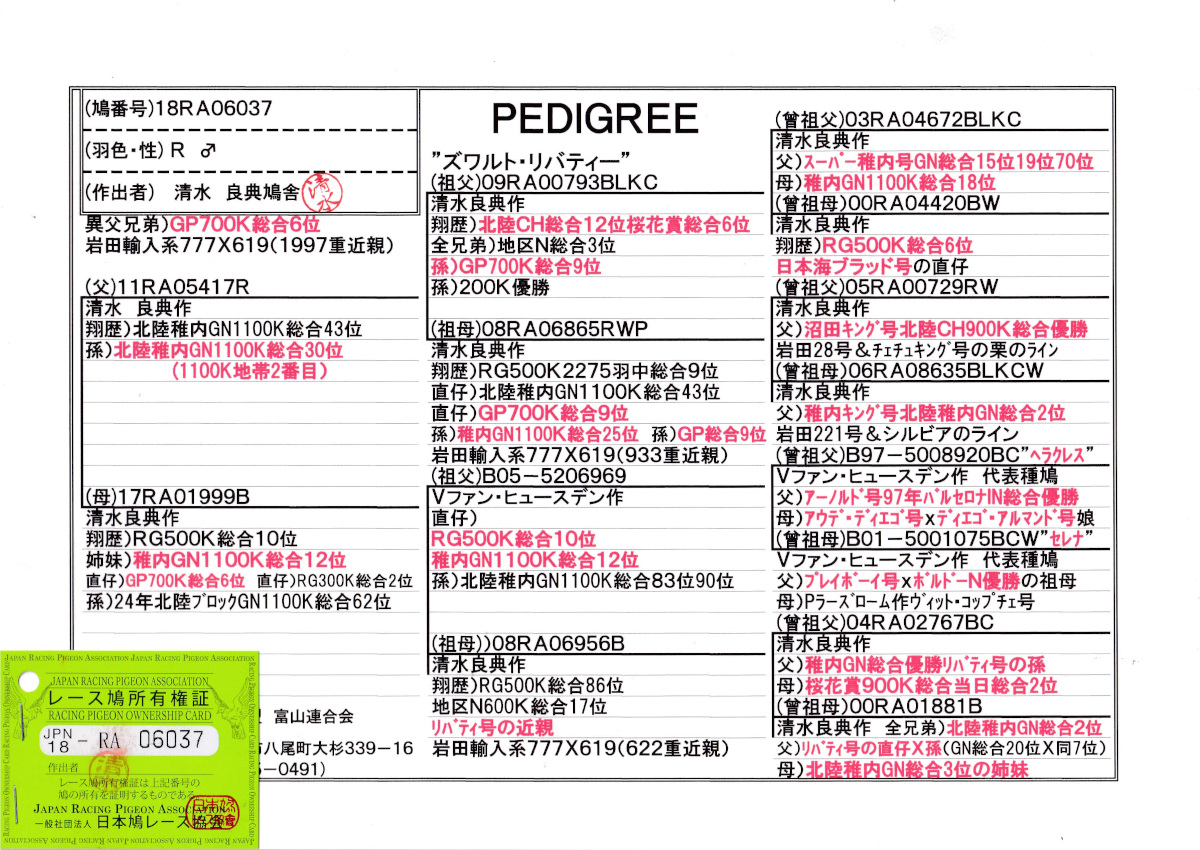 出品鳩♂24番「18RA06037 R♂」清水良典作半兄弟)RG総合2位鳩GP総合6位鳩 北陸GN総合43位(ズワルト・リバティ号直仔)×RG総合10位(兄弟GN総合12位) ![]() |
