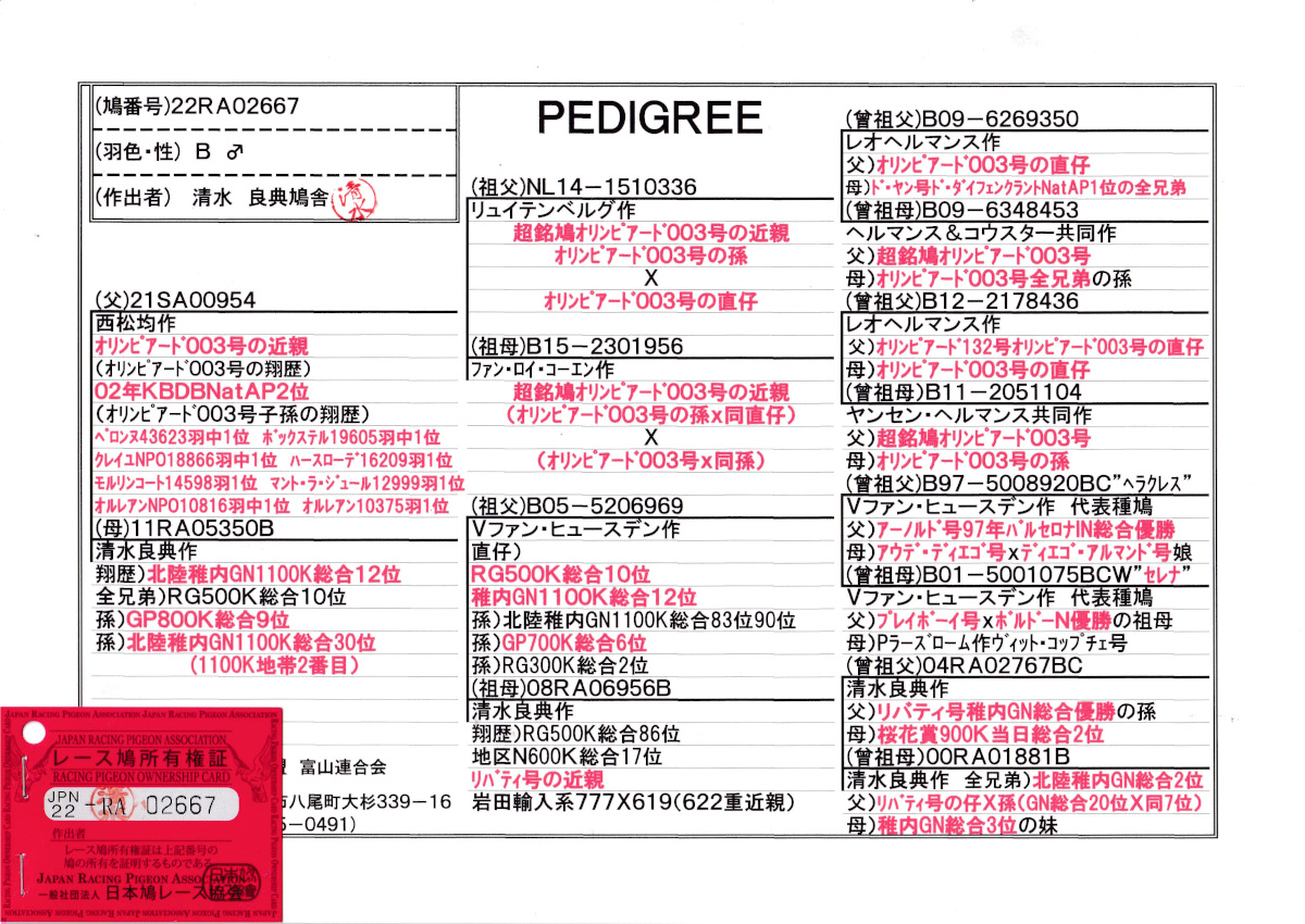 出品鳩♂35番「22RA02667 B♂」清水作西松作(銘鳩オリンピード003号近親孫X近親孫)×GN総合12位(アーノルド孫×PN総合17位&岩田系リバティ号GN総合優勝近親) ![]() |