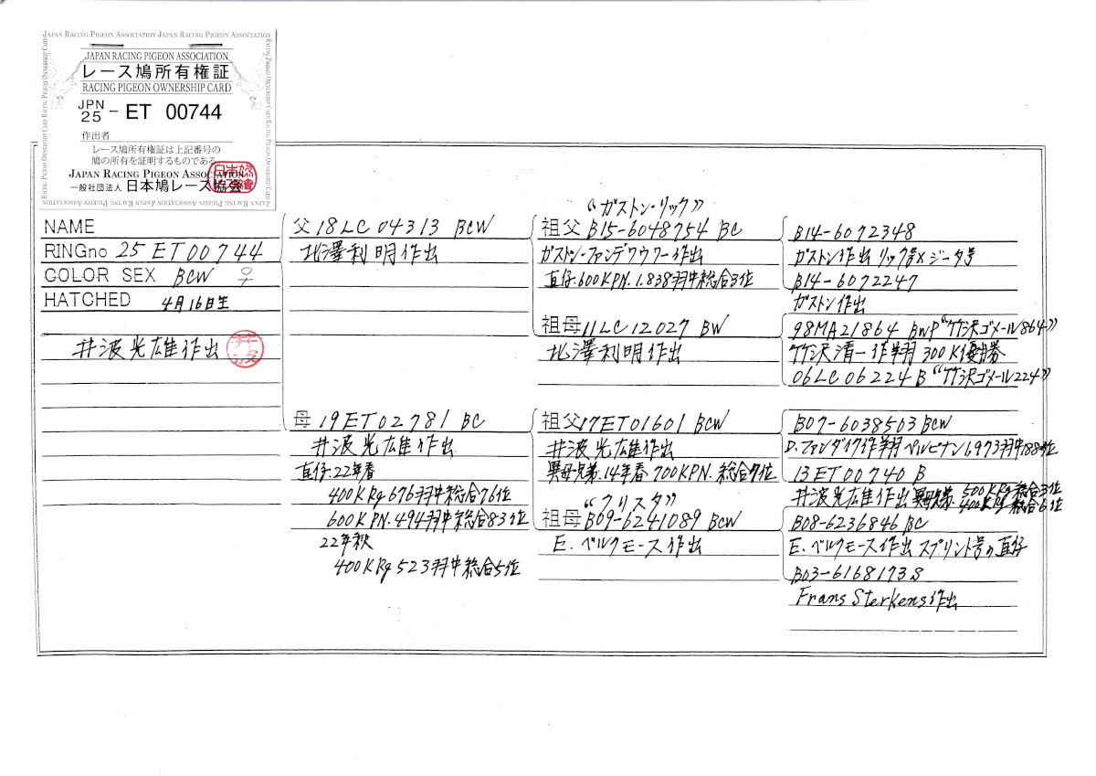 出品鳩若25番「25ET00744 BCW」井波作半兄弟)秋RG総合5位 PN総合3位半兄弟(カースブーア近親直仔×PN総合7位半兄弟(ファンダイク作翔×スブリント号孫) ![]() |