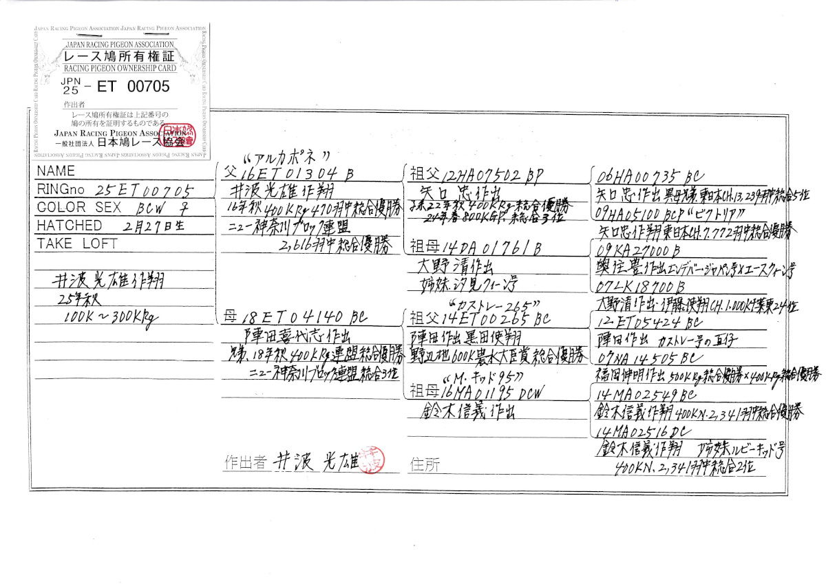 出品鳩若4番 「25ET00705 BCW」井波光雄鳩舎作翔秋300K迄 アルカポネ号ニュー神奈川ブロック400K2616羽総合優勝鳩×陣田作18年秋RG400K総合優勝ブロック総合3位兄弟鳩&カストレー265号黒田翔600K農水賞総合優勝の娘鳩 との直仔です。 父親 ♂2番"アルカポネ号"「16ET01304 B ♂」井波光雄鳩舎作翔 16年秋RG400K470羽総合優勝ブロック2616羽総合優勝鳩で 矢口鳩舎ビクトリア号東日本CH総合優勝鳩の直仔×大野作O&T汐見クィーン号東日本CH総合優勝の全姉妹鳩 との直仔です。 母親 「18ET04140 BC」陣田喜代志鳩舎作 兄弟に 18年秋RG400K総合優勝ブロック総合3位鳩がいる カストレー265号黒田翔600K農水賞総合優勝×鈴木作Mキッド95号(400K2341羽氏総合優勝の直仔)との直仔です。 詳しくは、血統書を参照してください。 <備考> 現在管理人の鳩舎で元気に暮らしています。写真3/2日に撮影しました。 菅原明鳩舎の概要はこちらをご覧ください |