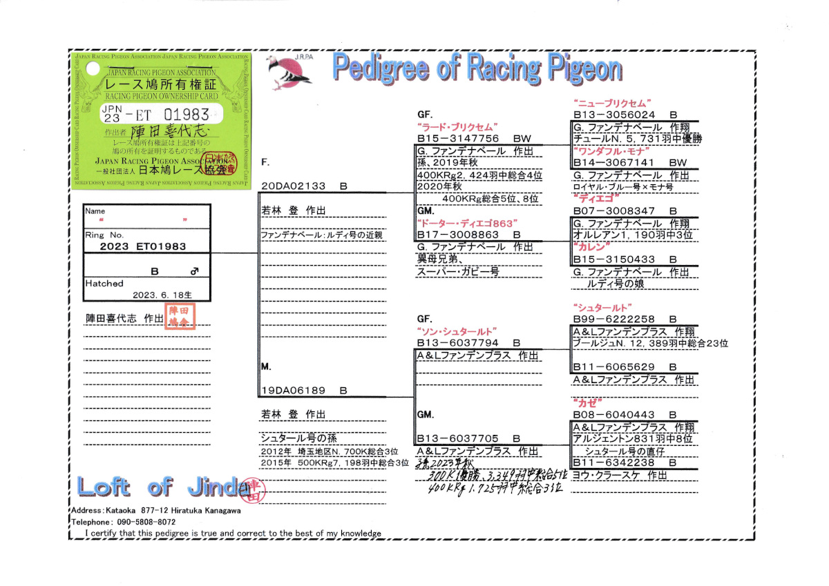 出品鳩♂19番「23ET01983 B♂」陣田作 両親カビー作ニューブリクセン号チュールN総合優勝孫×両親ファンデンプラス作シュタールド号ブールジュN総合23位孫鳩 ![]() |
